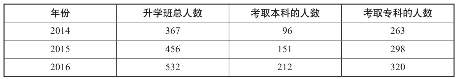 从表格的信息中可以得出,就读“升学班”的学生人数正在增加,本科率也逐渐提高。前几年中还有部分学生拒绝参加高考(觉得前途渺茫),后面几年中学生都会努力地去争取高考。在该职业高中的新闻首页也连续几年播报高考取得佳绩,在全市中名列前茅。