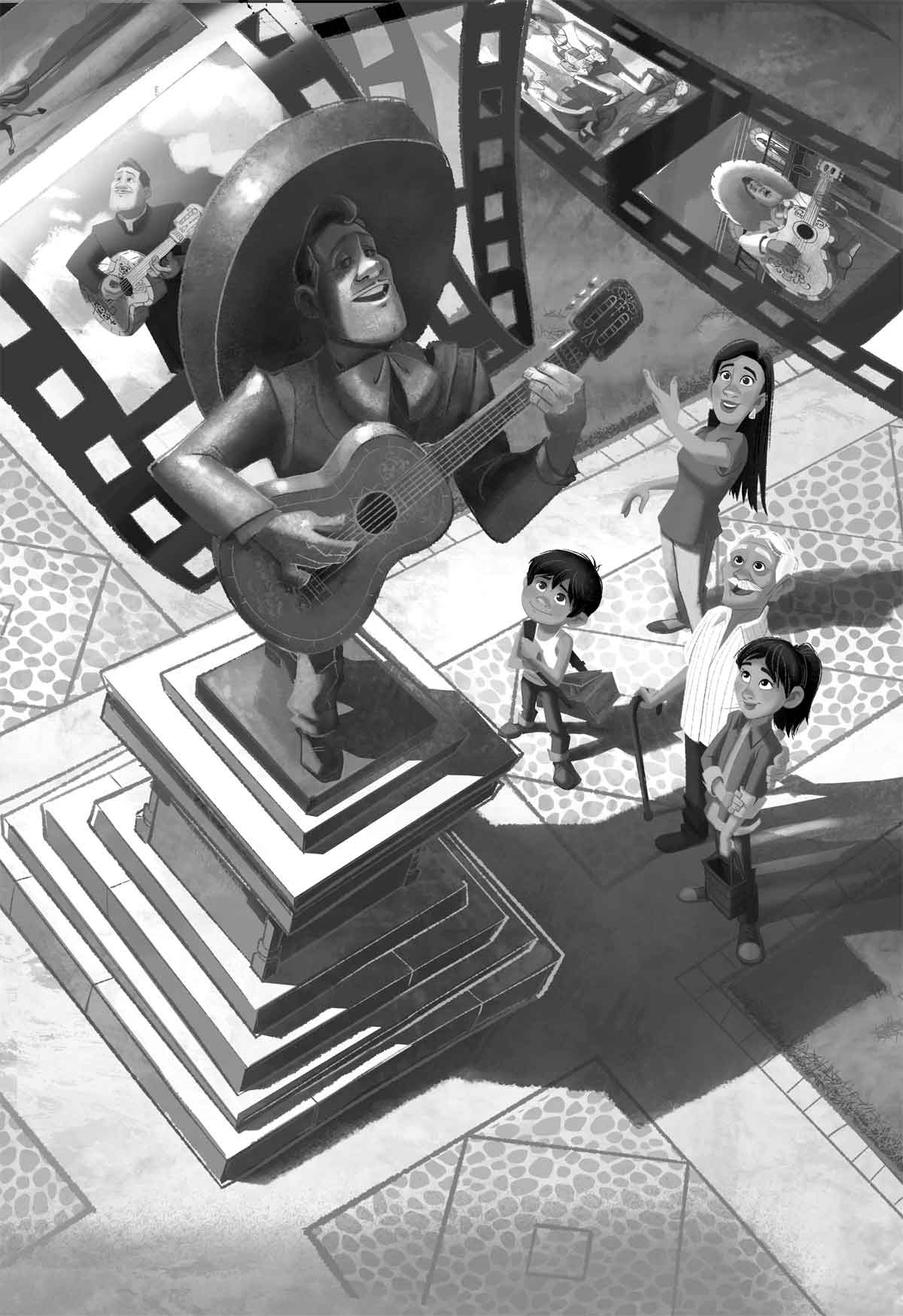 He glances down at Dante and pets him. “De la Cruz,” Miguel says, “he was just . . . he was the guy, you know? He started out a total nobody from Santa Cecilia, like me. But when he played music, he made people fall in love with him.” Dante wags his tail. Miguel's told this story a dozen times, and Dante always seems happy to hear it. “He traveled the world,” Miguel goes on. “He starred in movies. Oh, plus he had the coolest guitar. And he wrote the best songs! But my all-time favorite? It's—”