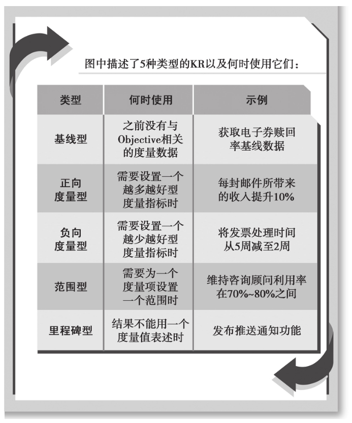 1.正向度量型:正向度量型通常会使用诸如“增加”“增长”“建立”等类词汇。例如,“每发出一封邮件收入增加10%”这个KR就是用积极正向语言来表述的。