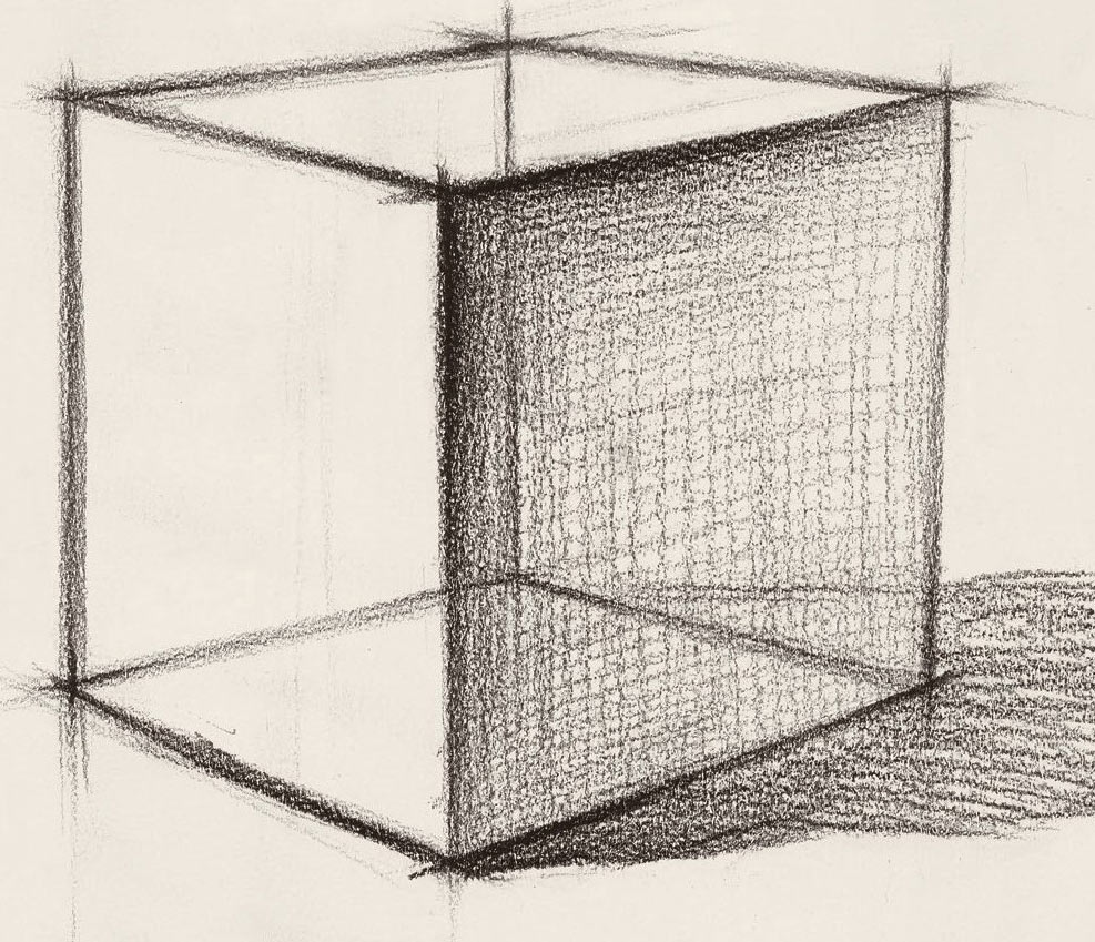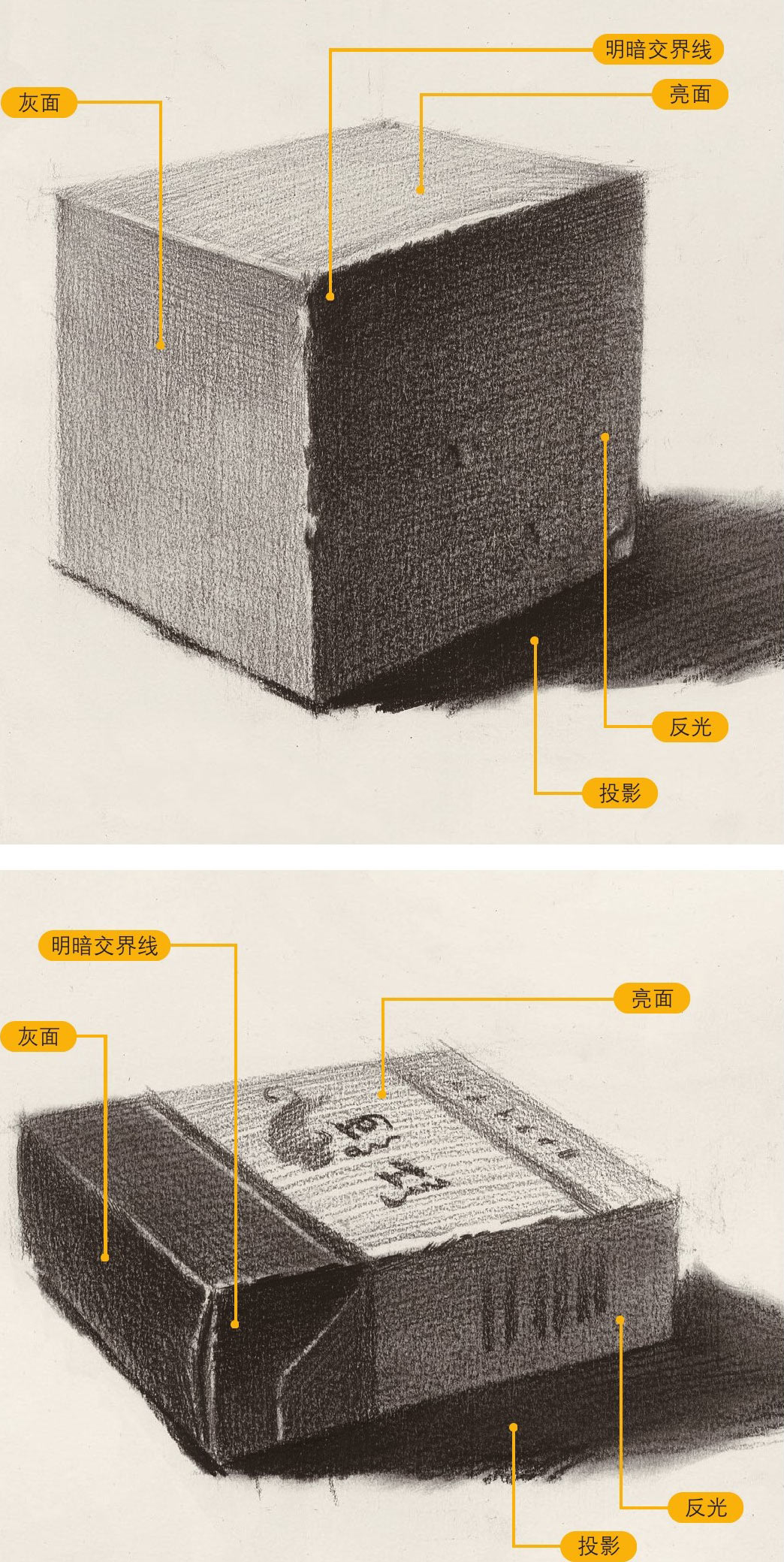 从明暗关系上来讲,石膏立方体可明确分清亮面、灰面和暗面。通过明暗交界线分出的亮面和暗面中,亮面里有灰面,暗面里有反光。注意近实远虚,阴影由近到远,颜色由深到浅。