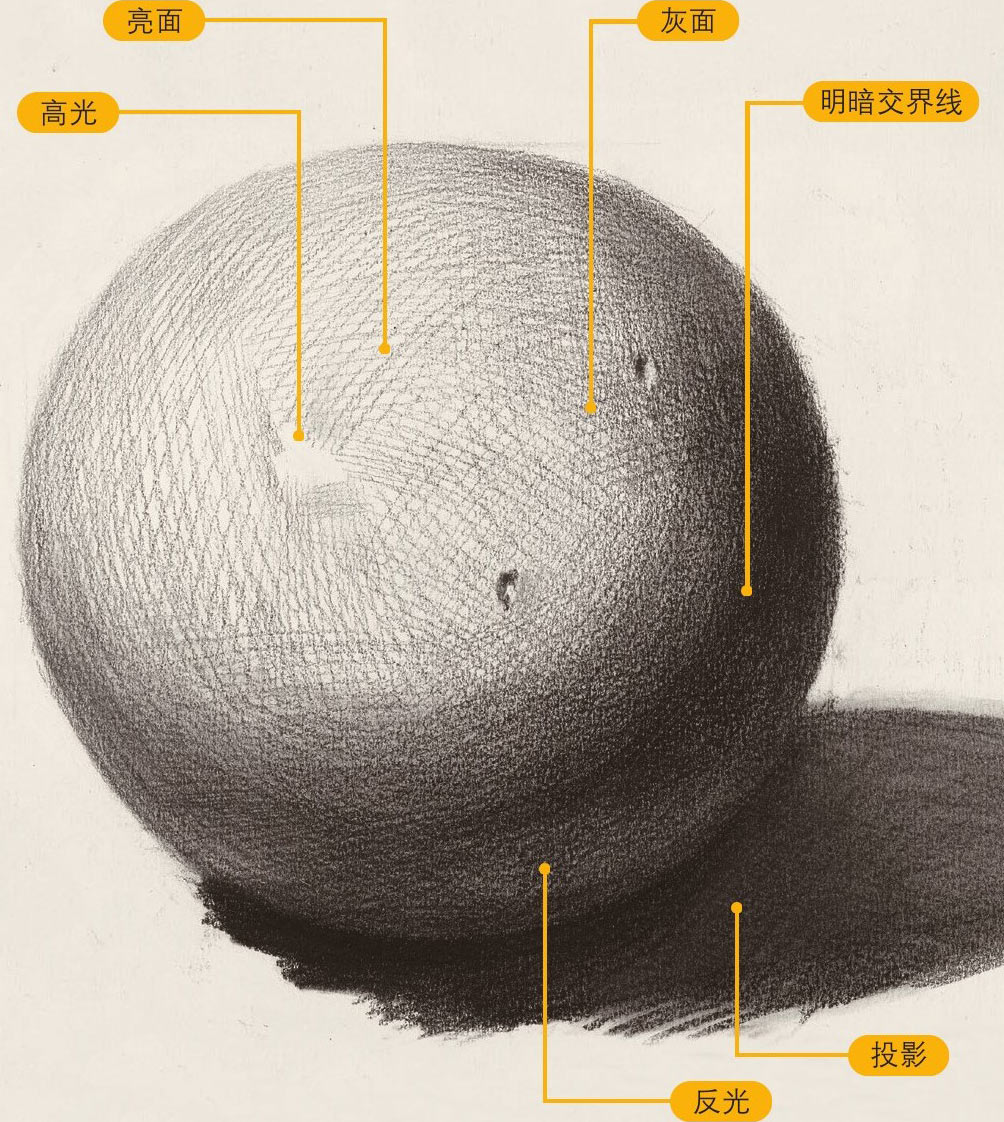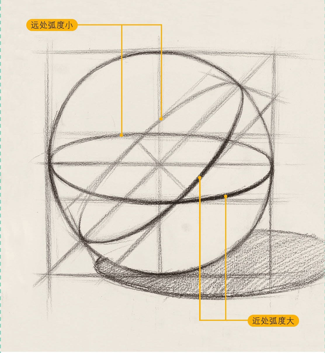 从外形结构上来讲,无论从什么角度观察圆球体都是相同的圆形,所以画圆球体的结构素描时,只能通过结构线来强调其结构、体积,注意结构线椭圆面前面弧线的弧度要比后面的大。
