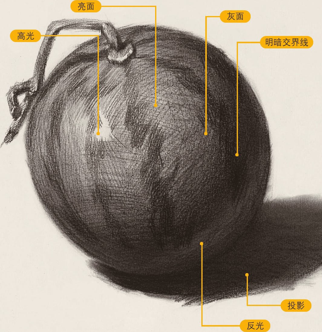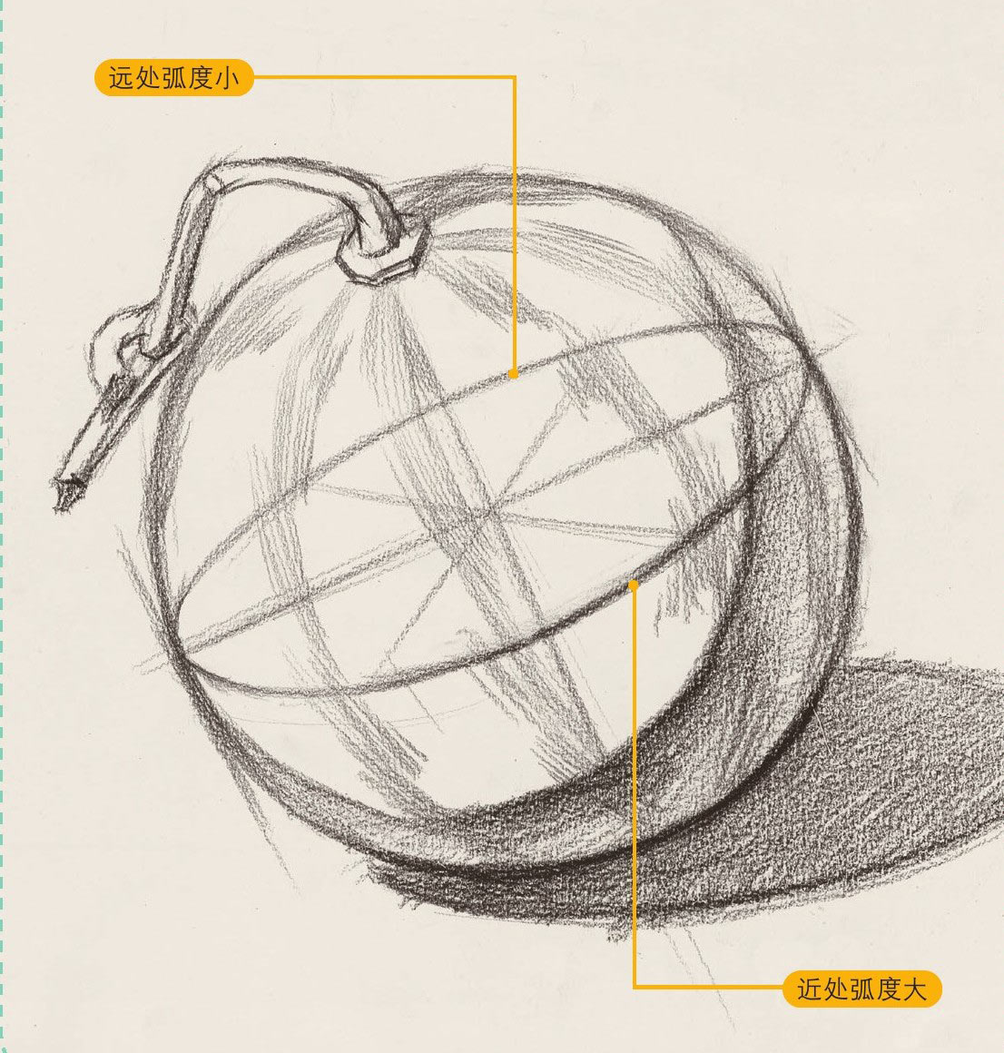 画西瓜时可以根据对石膏圆球体结构的理解来表现其造型,包括瓜皮上纹理的走向。