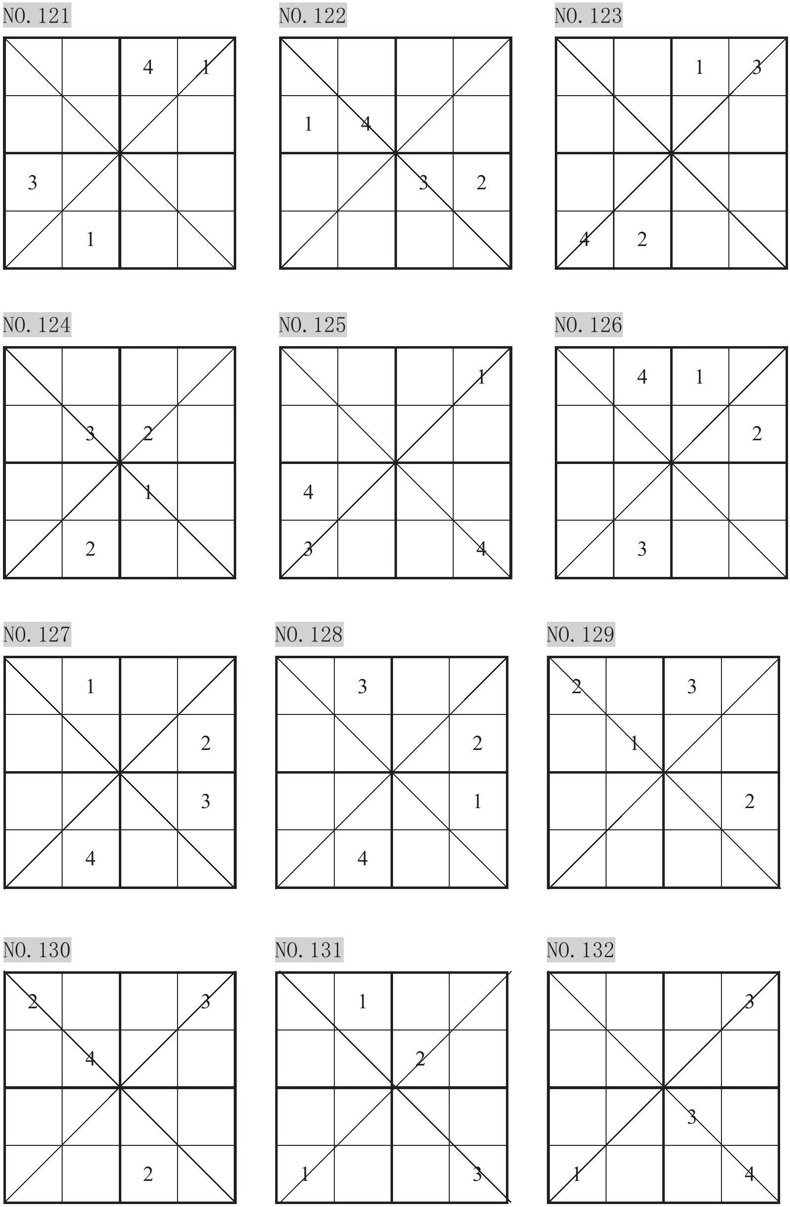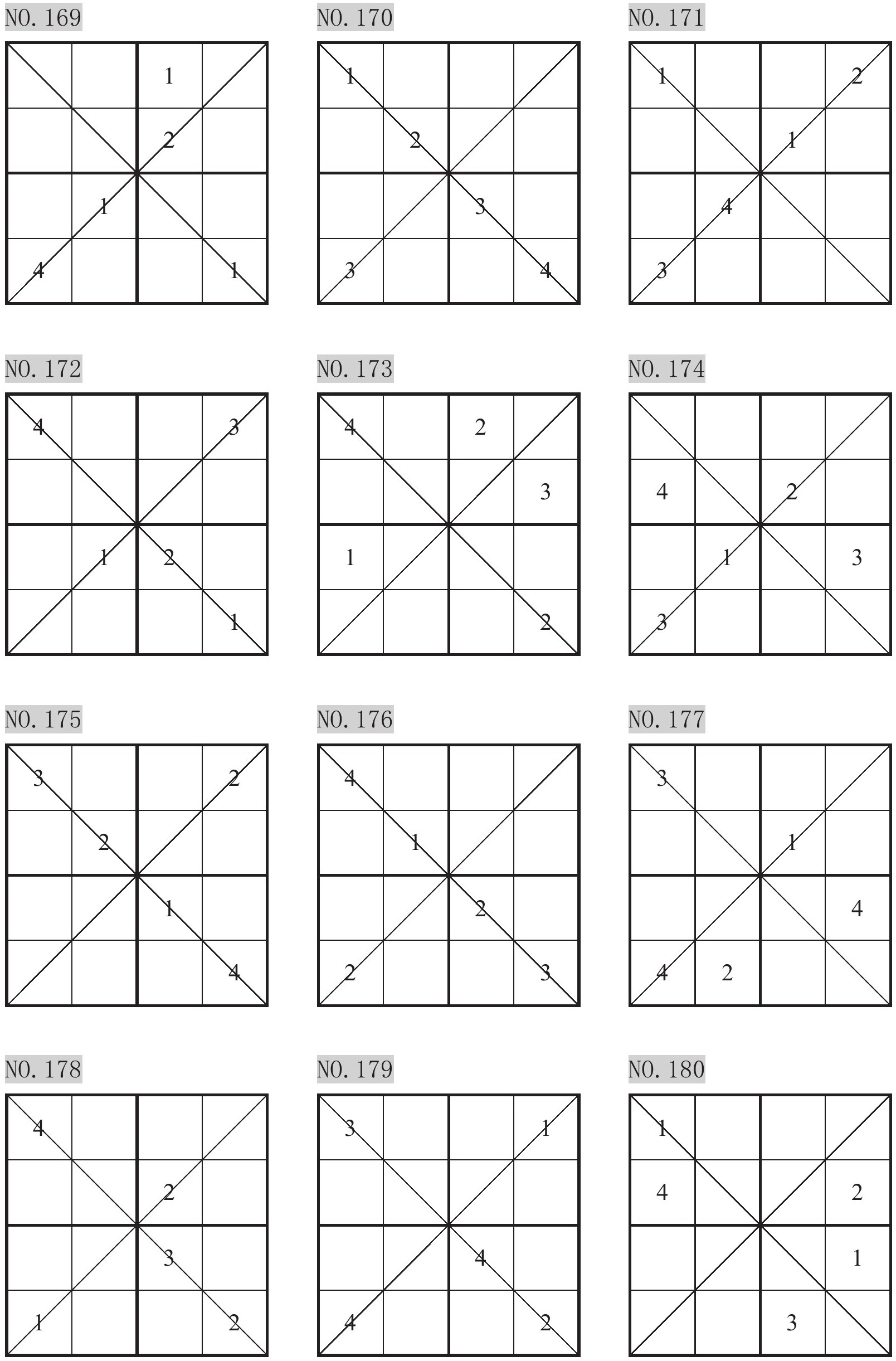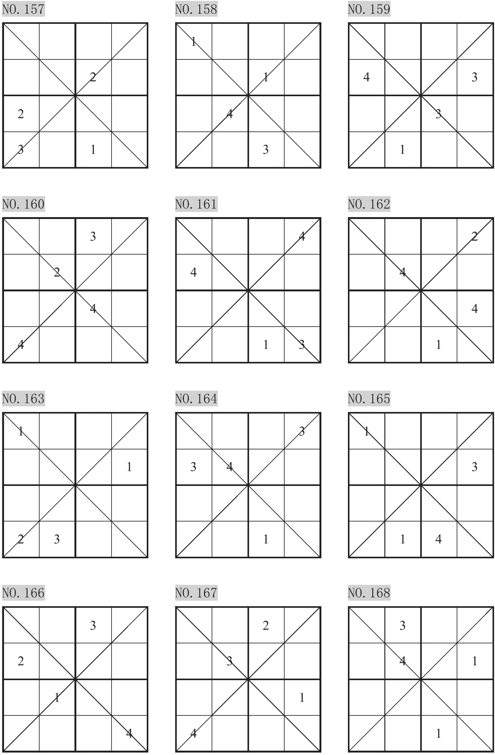 四字(4×4)对角线四宫阵数独与四字常规数独的外形完全相同,不同之处在于它除了每行、每列、中心四宫阵和4个顶角的小方格的数字1~4不重复之外,还必须保证两条对角线上4个小方格中的数字,也是1~4不重复,如图3-1所示,参照中心四宫阵数独的解题方法,再加上两条对角线上的4个小方格中的数字,1~4不重复的性质,很容易解题。