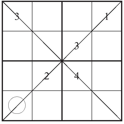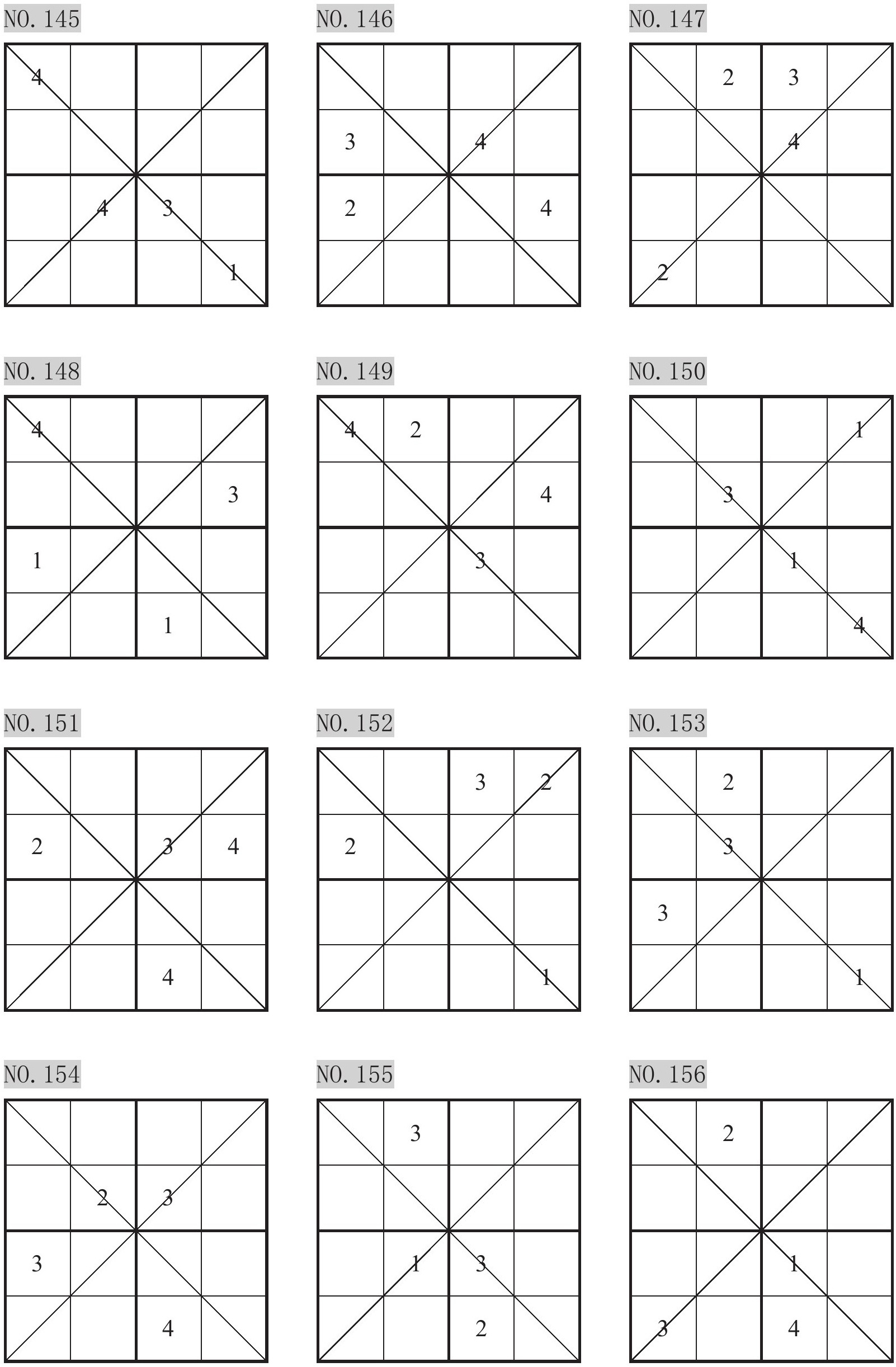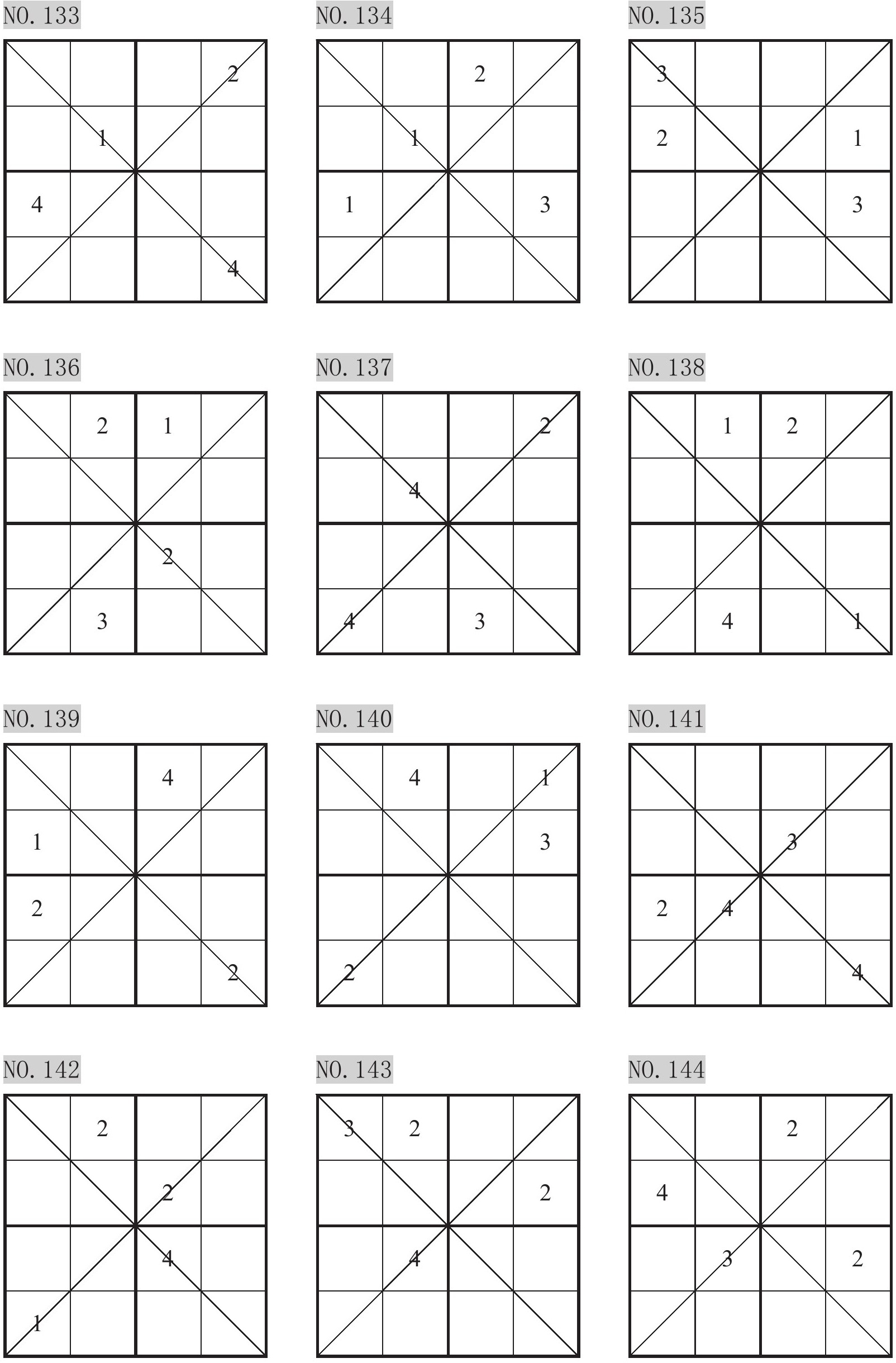 四字(4×4)对角线四宫阵数独与四字常规数独的外形完全相同,不同之处在于它除了每行、每列、中心四宫阵和4个顶角的小方格的数字1~4不重复之外,还必须保证两条对角线上4个小方格中的数字,也是1~4不重复,如图3-1所示,参照中心四宫阵数独的解题方法,再加上两条对角线上的4个小方格中的数字,1~4不重复的性质,很容易解题。