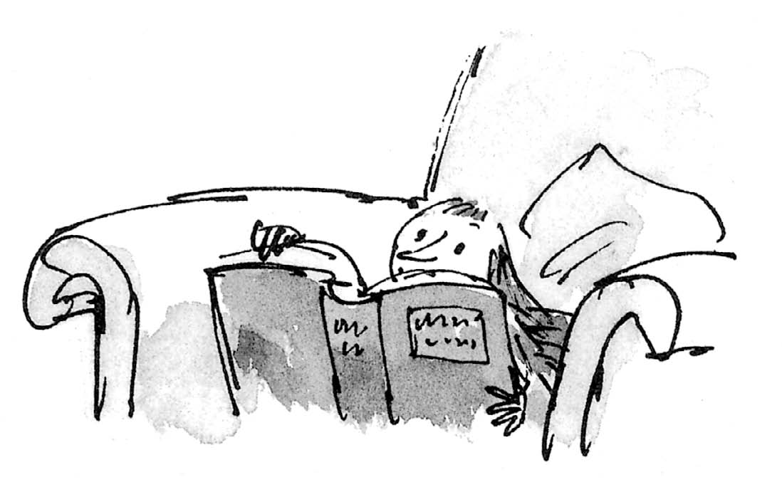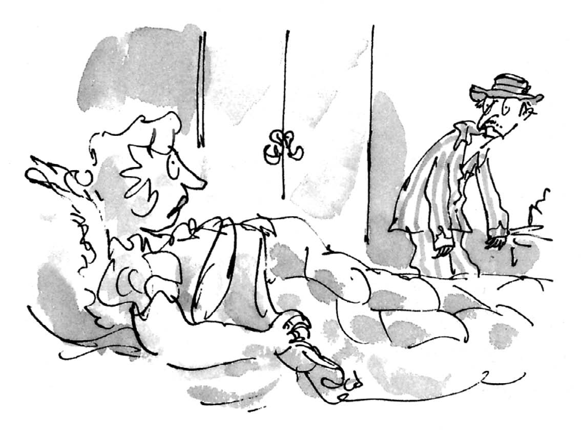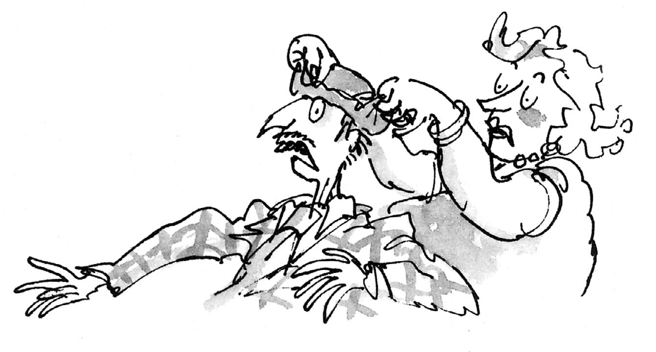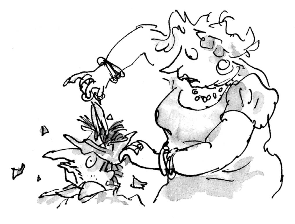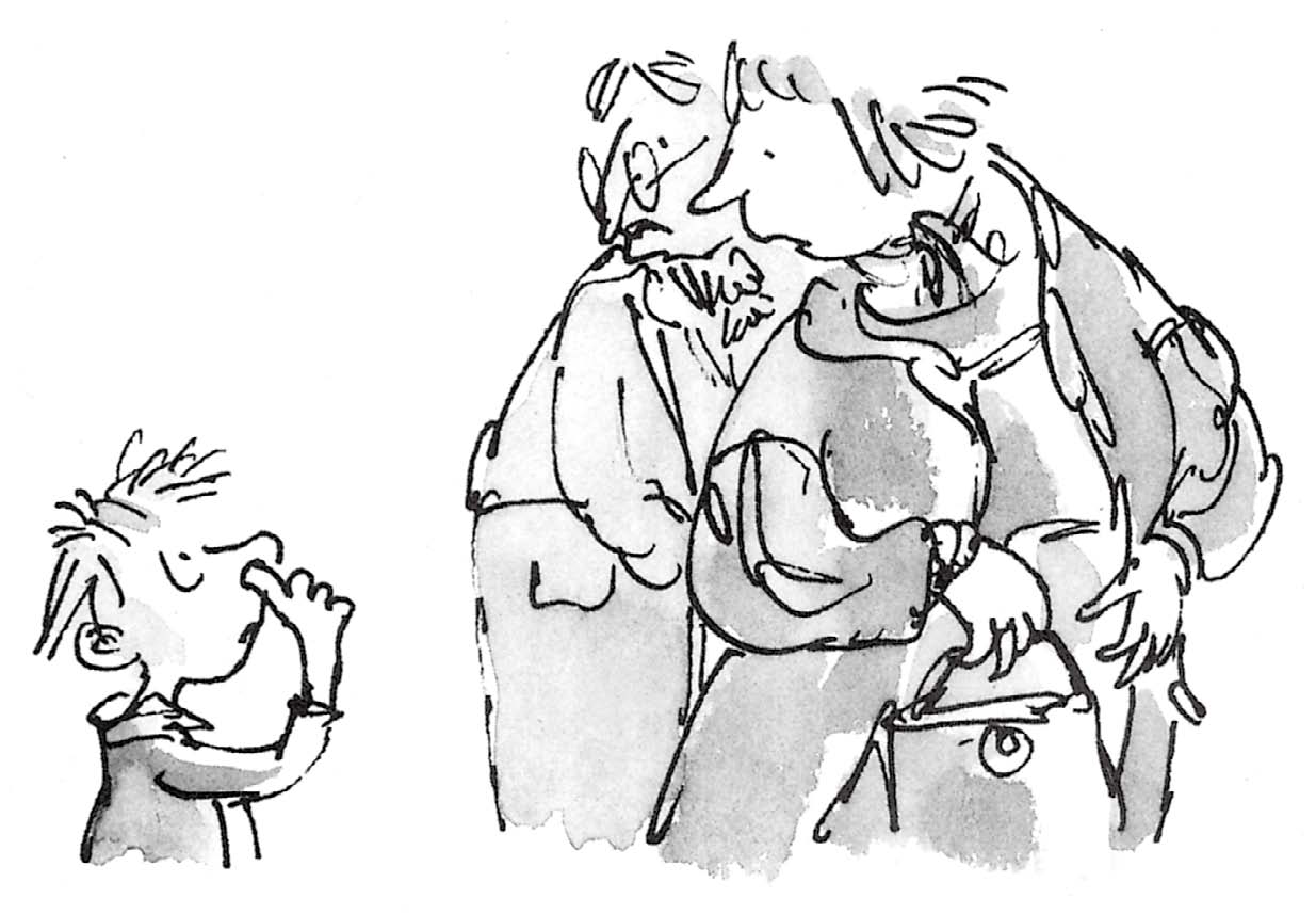 “手指粘在鼻子里面了。”玛蒂尔达说,“整整一个星期,他就只好这个样子走来走去。人们一个劲儿对他说:‘不要挖鼻孔!’可是他毫无办法。他那副模样看上去真像一个大傻瓜。”