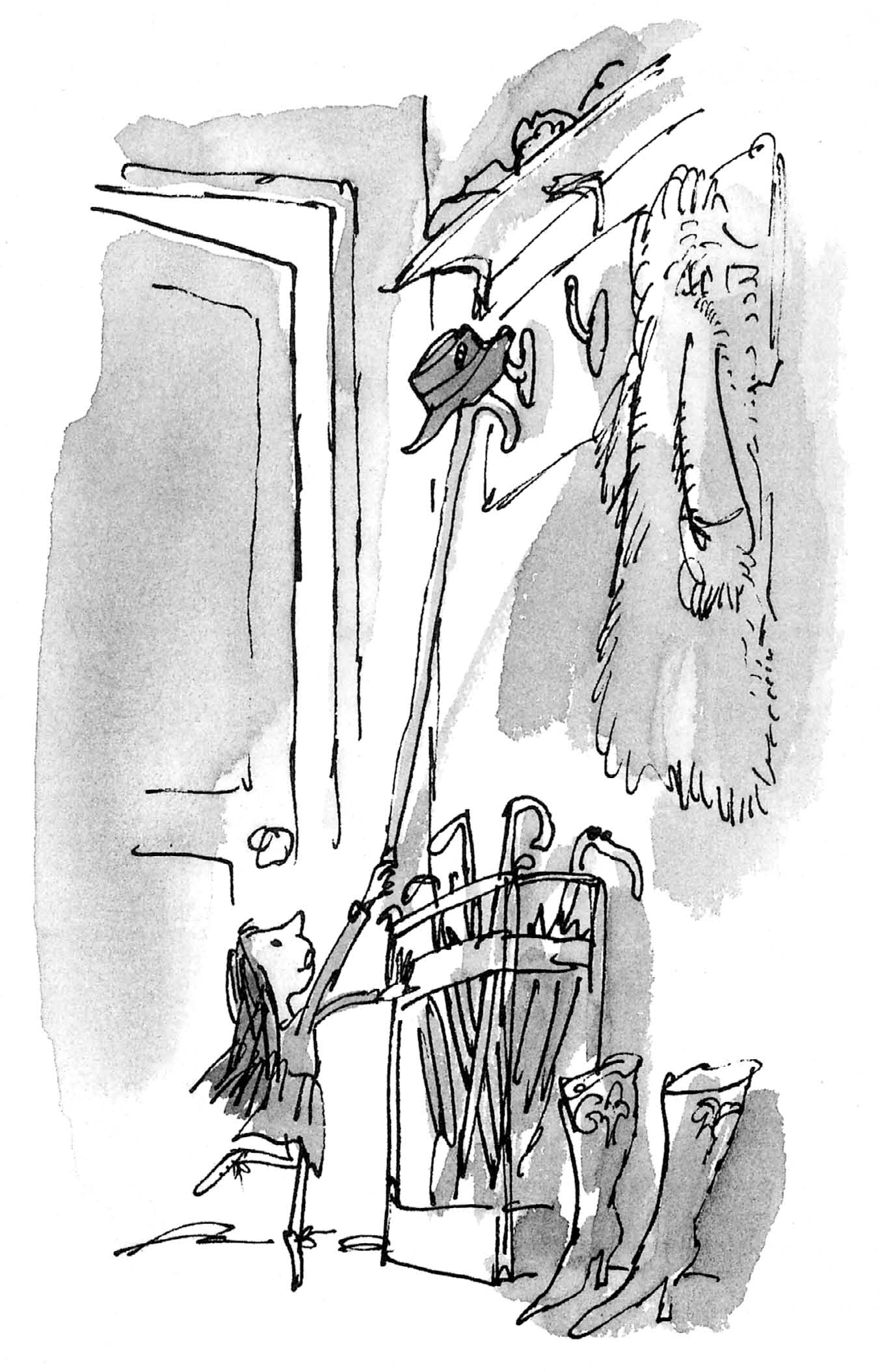 第二天早晨,就在爸爸去他那家倒卖旧汽车的汽车行之前,玛蒂尔达溜进了衣帽间,弄到了他每天出去时要戴的帽子。她踮起脚尖,把手杖尽可能往高处举,去钩衣钩上的帽子,即使这样,她也只是勉勉强强够得到,但她总算把帽子从衣钩上钩下来了。这是一顶卷边低平顶帽子,帽箍上插着一根㭴鸟羽毛。沃姆伍德先生为这顶帽子感到十分自豪,他认为戴上它有一种花花公子的泼皮神气,特别是歪戴一点,再配上鲜艳的格子上衣,打上一条绿领带。