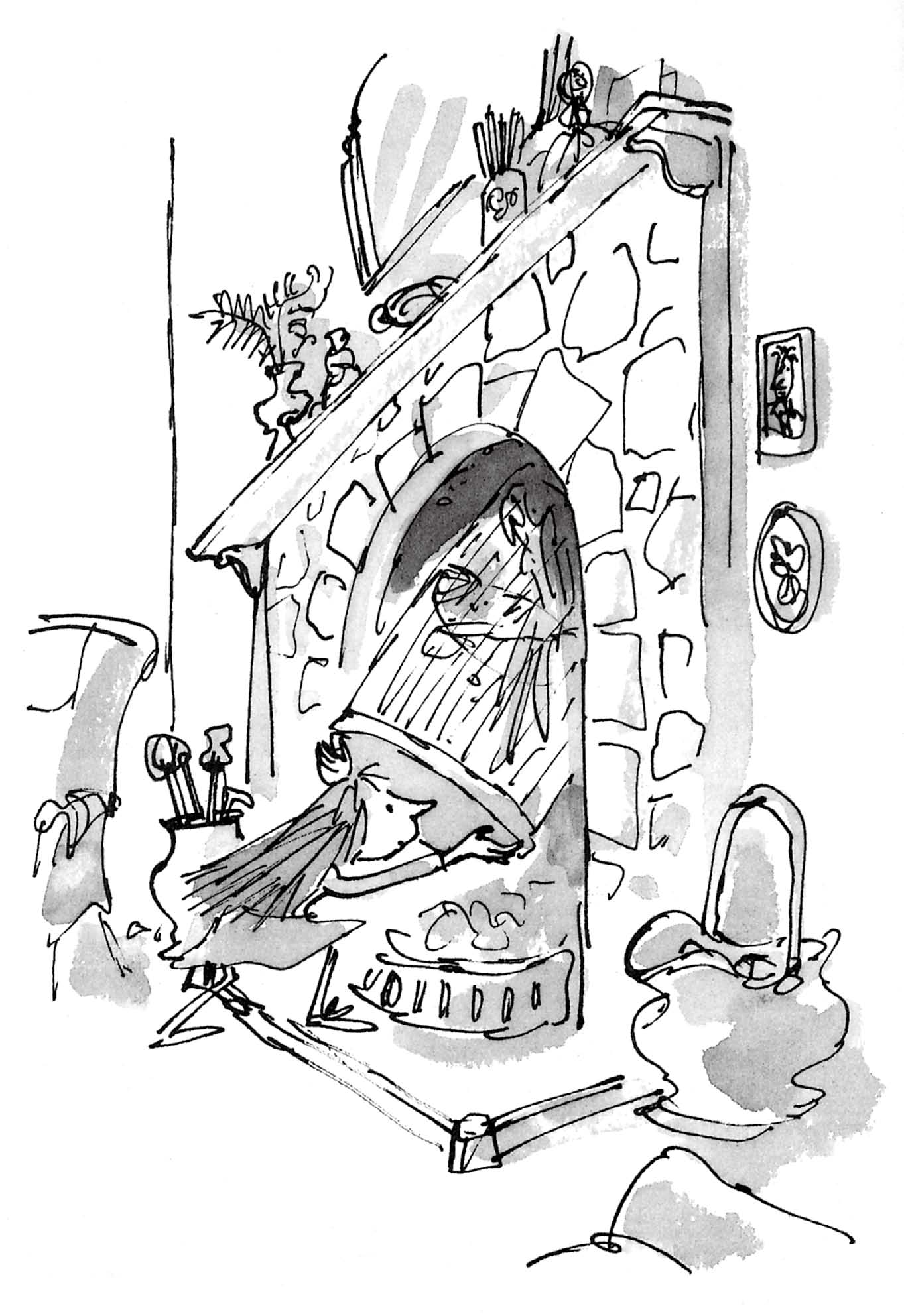 玛蒂尔达两手捧着那高高的鸟笼,摇摇晃晃地回到空无一人的家里。餐厅里有个大壁炉,她动手把鸟笼塞进嵌在壁炉上面的烟囱里,不让人看见。这件事不太好办,可是她终于办成了。