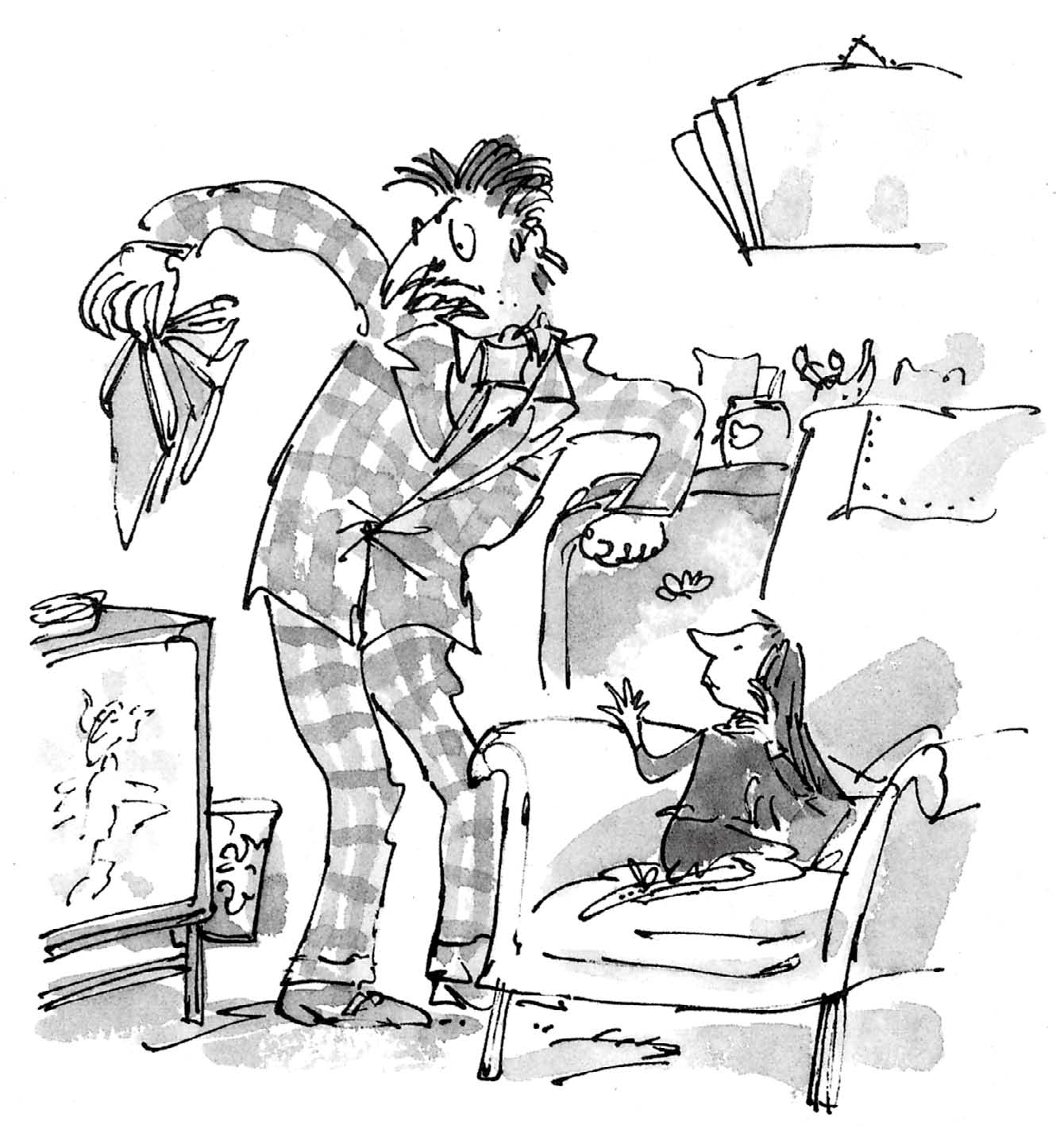 “我肯定听见了他的声音!”玛蒂尔达叫道,“他准在这里的什么地方!”她开始在沙发后面窗帘后面找。
