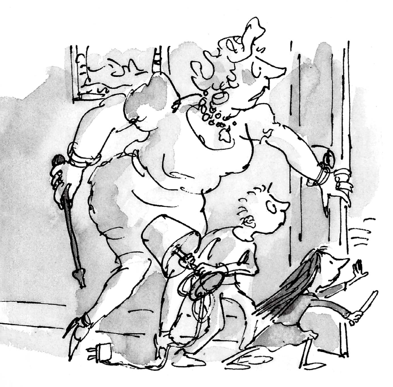 “来吧!”玛蒂尔达一声大叫,高举她的餐刀,带头冲进房间。“把双手举起来!”她哇哇叫道,“我们已经捉住你了!”其他人晃动着各自的武器跟着她。接着他们停下来环顾整个房间,里面一个人也没有。