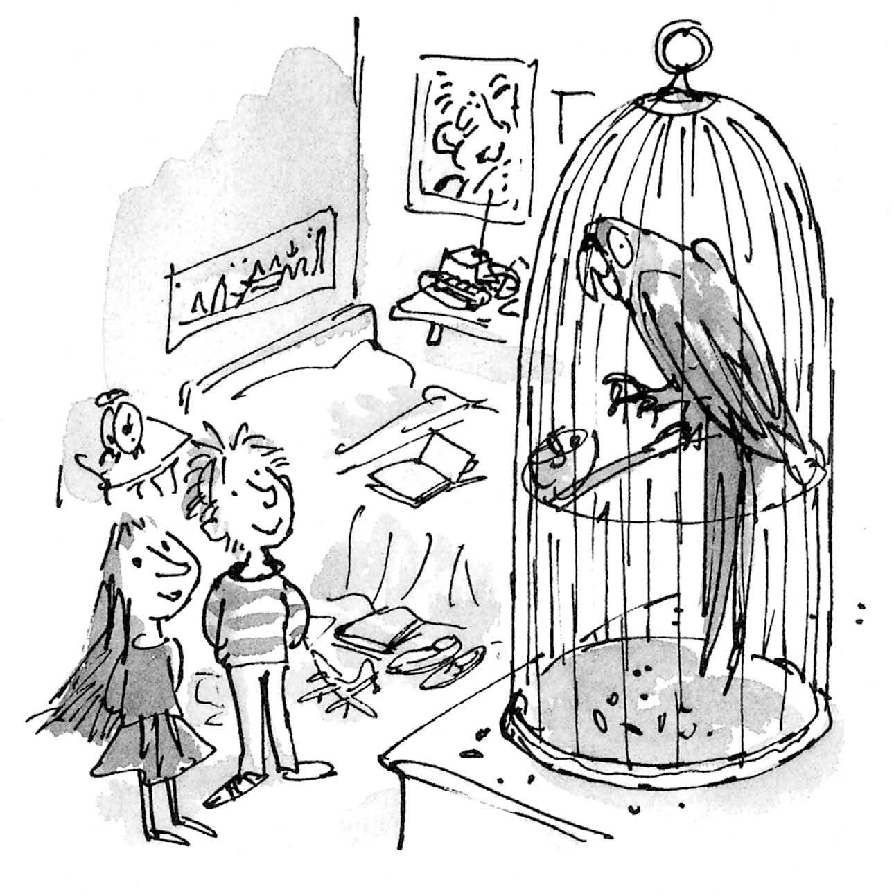 第二天下午,玛蒂尔达好不容易才把浑身是煤灰、大发脾气的鹦鹉从烟囱里拿了出来,悄悄地把它送走。她捧着它出了后门,一口气跑到了弗雷德家。