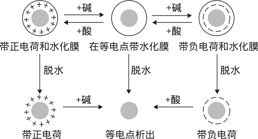 蛋白质是高分子化合物,分子量界于10000~1000000kDa之间,其分子大小达到胶体颗粒1~100nm范围之内,故蛋白质具有胶体性质。蛋白质分子黏度大,扩散速度慢,不易透过半透膜。血浆蛋白等大分子胶体物质不能通过毛细血管壁,是影响血管内外水平衡的重要因素。球状蛋白质的表面多为亲水基团,在溶液中具有强烈的吸引水分子作用,使蛋白质分子表面被多层水分子包围形成水化膜,从而将蛋白质分子相互隔开。同时,亲水R侧链的大多数基团可以解离,使蛋白质分子表面带有一定量的同种电荷,相互排斥以防止聚集,因而分散在水溶液中的蛋白质是非常稳定的胶体溶液。当破坏蛋白质胶体颗粒表面的水化膜、中和电荷时,蛋白质可从溶液中析出沉淀。