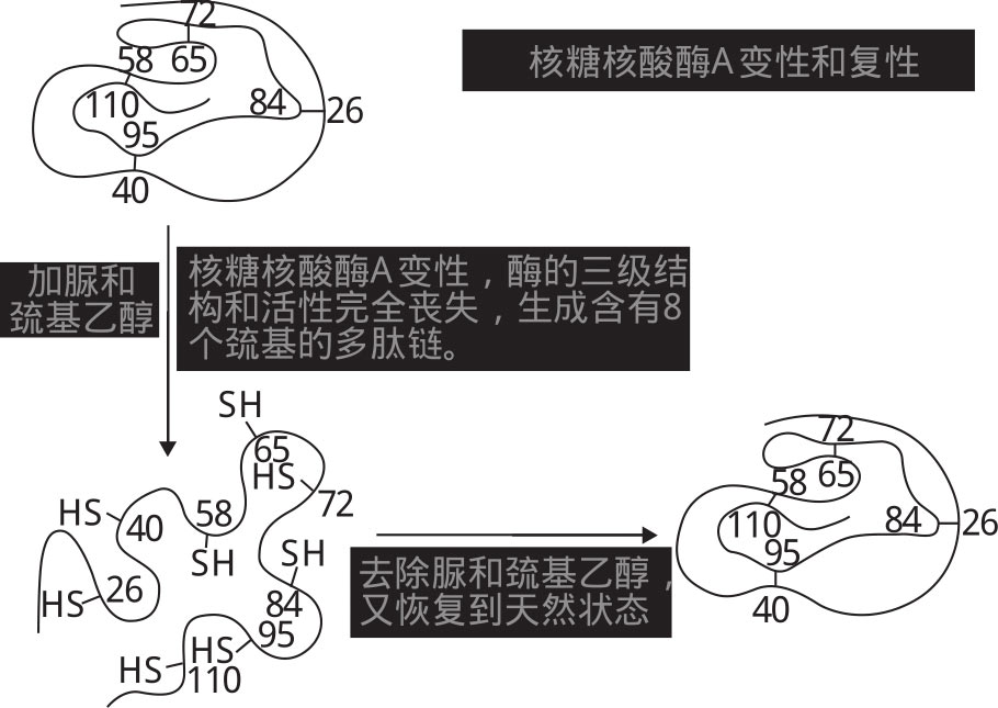 有些蛋白质的变性是可逆的。当变性程度较轻时,如果除去变性因素,蛋白质的构象和功能可以恢复或者部分恢复,这种现象称为蛋白质复性。例如核糖核酸酶在巯基乙醇和尿素作用下,发生变性,生物活性丧失;如果通过透析除去巯基乙醇和尿素,则构象和活性完全恢复(图2-10)。