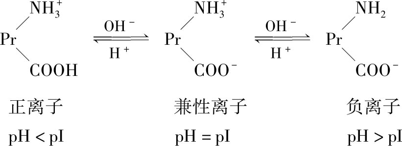 蛋白质分子除两端的氨基和羧基可分别解离带电荷外,其侧链的某些基团如天冬氨酸的 β -羧基、谷氨酸的 γ -羧基,赖氨酸的 ε -氨基,精氨酸的胍基和组氨酸的咪唑基,都可以解离。在一定pH条件下有的带正电荷,有的带负电荷。因此蛋白质分子也是两性电解质,在溶液中的解离状态以及带电状态受溶液pH值的影响。当溶液处于某一pH值时,蛋白质分子所带的正、负电荷相等,呈兼性离子状态,净电荷为零,此时溶液的pH值称为该蛋白质的等电点(p I)。蛋白质的解离状态可用下式表示: