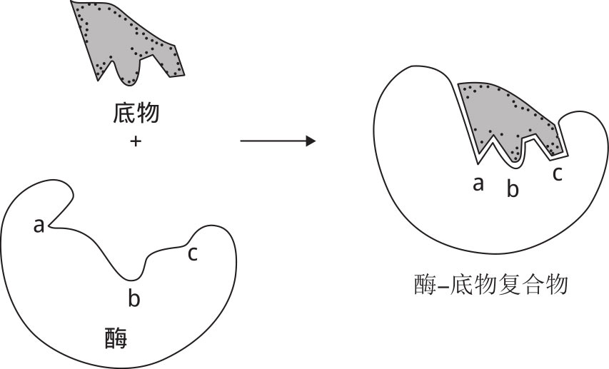 为什么酶能大幅度降低反应的活化能?大量资料证明,在酶促反应中,酶(E)活性中心总是先与特异底物(S)形成不稳定的酶-底物复合物(ES中间产物),再分解成酶和产物(P),即“中间产物学说”。释放出来的酶又可以和下一个底物结合,继续发挥催化作用,所以少量的酶就可以催化大量的底物发生反应。酶在与底物分子相互接近时,其结构相互诱导、相互变形和相互适应,进而相互结合。这一过程称为酶与底物结合的“相互诱导契合假说”(图4-3)。酶构象的改变有利于与底物结合;底物分子在酶的诱导下某些化学键发生极化而呈现不稳定状态(也称过渡态),从而大幅降低了活化能,反应速度大大加快。