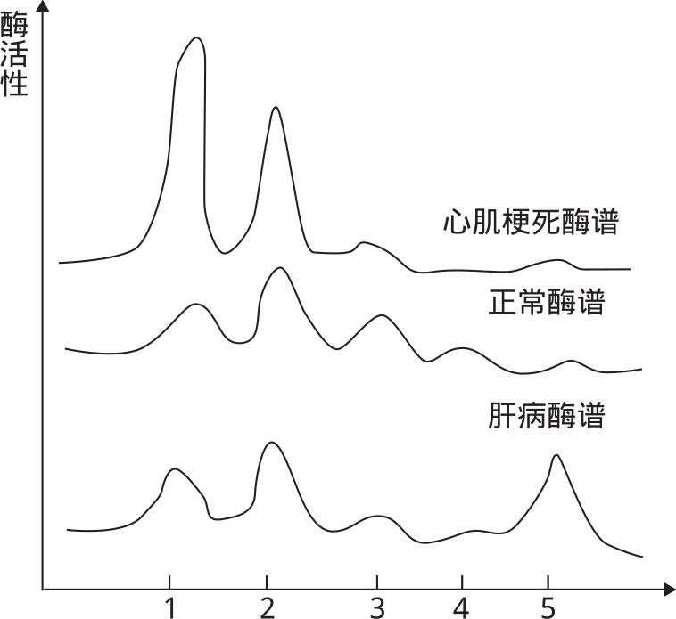 不同器官存在的同工酶随器官代谢环境的变化而改变。正因为一种酶的同工酶在各组织器官中分布与含量上的差异,从而使血清同工酶的测定成为现代医学中一种灵敏、可靠的诊断手段。临床上通过对患者血清同工酶电泳图谱的变化,作为某些器官组织病变诊断及鉴别的依据。例如,心肌梗死患者LDH 1 含量明显升高,肺梗死患者LDH 3 含量明显升高,而肝细胞受损患者LDH 5 含量明显增高(图4-6)。肌酸激酶(CK)是二聚体酶,其亚基有M型(肌型)和B型(脑型)两种。脑中含CK 1 (BB型),骨骼肌中含CK 3 (MM型),CK 2 (MB型)仅含于心肌中。因而CK 2 对于心肌梗死的诊断具有很好的特异性。