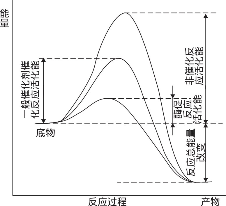 酶之所以具有高度的催化效率,是因为酶能显著地降低反应的活化能(图4-2)。在化学反应体系中,参与反应的每个分子具有的能量状态不同。在反应发生的每一瞬间,只有那些具有较高能量,达到或超过一定能量水平的分子(即活化分子)才有可能发生化学反应。体系中活化分子越多,反应速度越快。把底物从“静态”非活化分子转变成可发生化学反应的活化分子所需的能量,称为活化能。反应所需活化能越高,相对活化分子就越少,反应速度就越慢。反之则越快。活化能的改变可以有两种方式,供给能量或降低需求。酶所起的作用就是降低底物分子对活化能的需求。例如H 2 O 2 的分解反应,在无催化剂时,活化能为75kJ/mol,用胶态钯作催化剂,活化能为50kJ/mol,而用过氧化氢酶来催化,活化能仅需8kJ/mol。由于过氧化氢酶的催化,使活化能大幅度降低,能达到发生反应的活化状态的分子就大幅度增加,反应速度上升的幅度可达10亿倍以上。