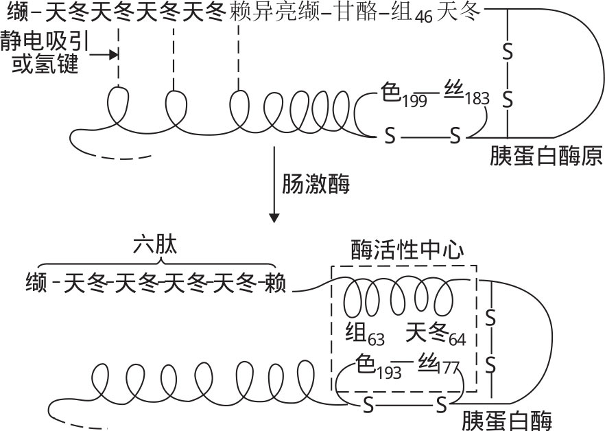 酶原激活的机制主要是分子内肽链的一处或多处断裂同时使分子构象发生改变从而形成酶活性中心所必须的构象,或者使原本被包裹的活性中心暴露。如胰蛋白酶原进入小肠后,在Ca 2+ 存在下受肠激酶激活,第六位赖氨酸残基与第七位异亮氨酸残基之间的肽键被切断,失去一个六肽。断裂后的N端其余部分解脱张力的束缚,像一个放松的弹簧一样卷起来,使酶蛋白的构象发生变化,并把与催化有关的组氨酸 46 、天冬氨酸 90 带至丝氨酸 183 附近,形成一个合适的排列,因而自动产生活性中心,成为了有催化活性的胰蛋白酶(图4-5)。酶原激活的实质就是酶的活性中心形成或暴露的过程。