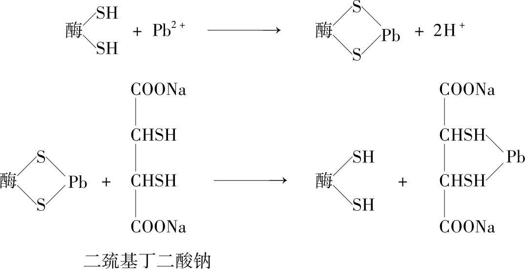 某些重金属(Pb 2+ 、Ag 2+ 、Hg 2+ 等)及As 3+ 可与酶分子的巯基共价结合,使酶失去活性。这些抑制剂所结合的疏基不局限于活性中心的必需基团,所以此类抑制剂被称为非专一性抑制剂。化学毒气路易氏气是一种含砷的化合物,它能抑制体内的巯基酶而使人蓄中毒。用二巯基丙醇或二巯基丁二酸钠等含巯基的化合物可使酶复活。