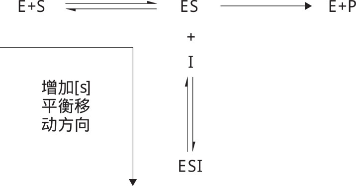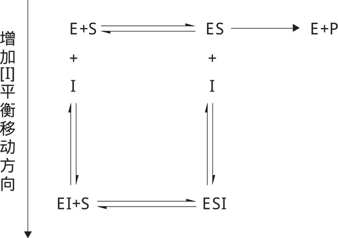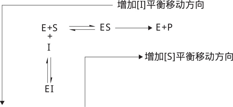 1.竞争性抑制 指抑制剂的构象与底物的构象相似,因而可以竞争同一个酶的活性中心,使底物与酶结合的几率下降,ES生成减少,从而使酶促反应速度降低。如图4-10所示,I和S对游离E的结合有竞争作用,互相排斥,已结合底物的ES复合体,不能再结合I。同样已结合抑制剂的EI复合体,不能再结合S。在竞争性抑制反应体系中,不可能生成EIS三元复合物。同时,这种抑制作用又是可逆的:增加底物的浓度,平衡会向解除抑制的方向移动;增加抑制剂的浓度,平衡会向增强抑制的方向移动(图4-11)。因此,抑制作用大小取决于抑制剂与底物的相对亲和力及与底物浓度的相对比例,加大底物浓度,可使抑制作用减弱。