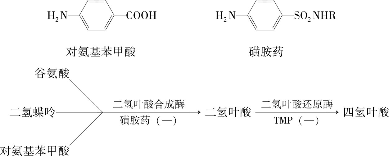 很多药物都是酶的竞争性抑制剂。例如磺胺药与对氨基苯甲酸具有类似的结构,而对氨基苯甲酸、二氢蝶呤及谷氨酸是某些细菌合成二氢叶酸的原料,后者可被继续还原为四氢叶酸(FH 4 )。FH 4 是一碳单位转移酶的辅酶,与嘌呤与嘧啶的合成密切相关(详见蛋白质代谢及核酸代谢章)。由于磺胺药是二氢叶酸合成酶的竞争性抑制剂,进而减少菌体内四氢叶酸的合成,使核酸合成障碍,抑制细菌的生长、繁殖。抗菌增效剂——甲氧苄氨嘧啶(TMP)能特异地抑制细菌的二氢叶酸还原为四氢叶酸,故能增强磺胺药的抑菌作用。根据竞争性抑制的特点,服用磺胺类药物时,必须达到血液中药物的有效浓度,因此可采取“首剂加倍”的方法,迅速发挥有效的抑菌作用。人类可以直接利用食物中的叶酸,故核酸合成不受磺胺药的干扰(但长期使用该类药物仍会导致人体叶酸来源的缺乏)。许多抗代谢物和抗癌药物几乎都是竞争性抑制剂。