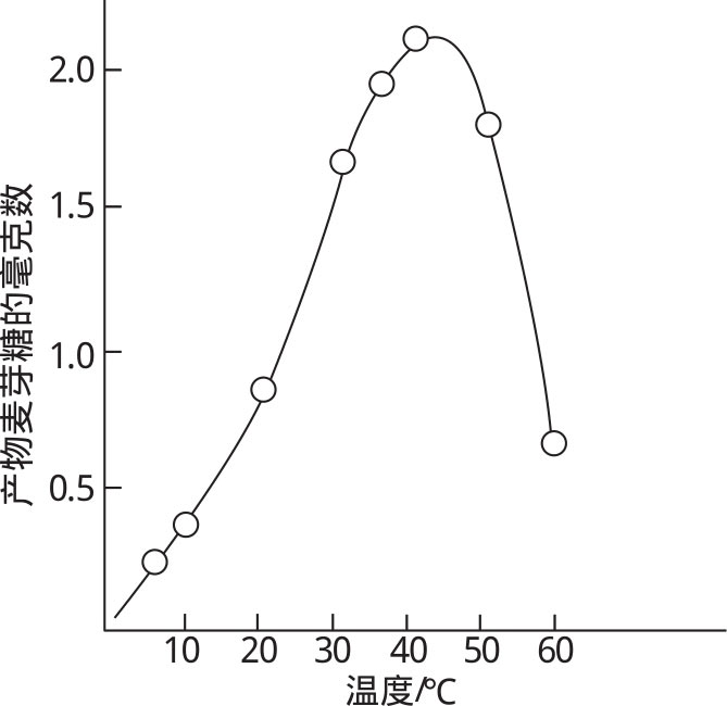 酶促反应的速度随温度增高而加快。但酶是蛋白质,可随温度的升高而变性。在温度较低时,反应速度随温度升高而加快。一般温度每升高10℃,反应速度大约增加一倍。但温度超过一定数值后,酶受热变性的因素占优势,反应速度反而随温度上升而减缓,形成类似抛物线形曲线。在此曲线顶点时的反应速度最大,称为酶的最适温度(图4-10)。