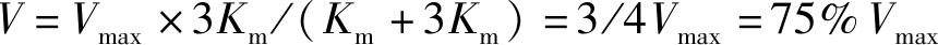 5.已知某个酶的 K m 值,可计算出在某一底物浓度时,其反应速度相当于 V max 的百分率。例如:当[ S ]=3 K m 时,代入米氏方程得: