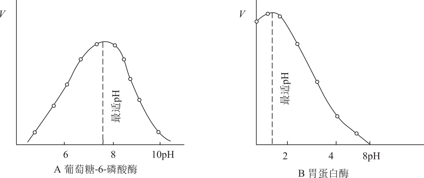 酶反应体系的pH值可影响酶分子中功能基团的解离度(特别是活性中心中必需基团的解离程度和催化基团中质子供体或质子受体所需的离子化状态),也可影响底物和辅酶的解离程度,从而影响酶与底物的结合。另外,过高或过低的pH值会改变酶活性中心的构象,甚至导致酶变性失活。只有在特定的pH值条件下,酶、底物和辅酶的解离情况最适宜于它们互相结合,并发生催化作用。使酶促反应速度达最大值时的pH值,称为酶的最适pH值。偏离最适pH值越远,酶活性越小,过酸或过碱可使酶变性失活。最适pH值和酶的p I值不一定相同。典型的最适pH曲线是钟罩形曲线(图4-9A),但也有一些例外(图4-9B)。