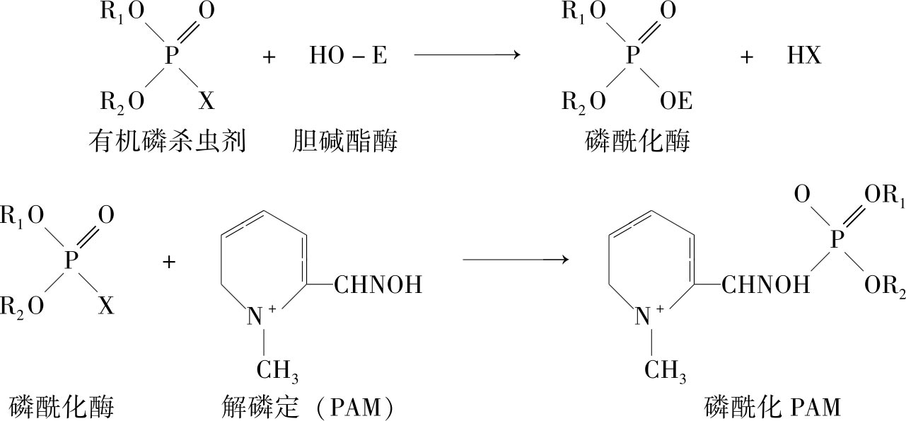 有机磷杀虫剂(敌百虫、敌敌畏、1059等)能特异地与胆碱酯酶活性中心丝氨酸残基上的羟基共价结合,使其磷酰化而抑制酶的活性,所以此类抑制剂被称为专一性抑制剂。当胆碱酯酶被有机磷杀虫剂抑制后,胆碱能神经末梢分泌的乙酰胆碱不能及时分解,堆积的乙酰胆碱会导致机体胆碱能神经过度兴奋的症状,即有机磷农药中毒。这种只与活性中心必需基团结合的抑制剂常被称为专一性抑制剂。解磷定(PAM)等药物可与有机磷杀虫剂结合,使酶和有机磷杀虫剂分离而复活。