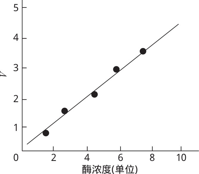 在底物浓度足够大的前提下,酶浓度与反应速度成正比。因为酶浓度越大,活性中心数量就越多,可结合的底物就越多,反应速度可呈正比增加(图4-8)。