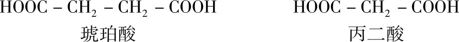 竞争性抑制典型的例子还有丙二酸对琥珀酸脱氢酶的抑制。丙二酸的结构与该酶的底物琥珀酸(丁二酸)非常相似,丙二酸与酶的亲和力远远超过琥珀酸与酶的亲和力。当丙二酸与琥珀酸的浓度比为1∶50时,琥珀酸脱氢酶的活性被抑制50%,当琥珀酸浓度不变时增加丙二酸浓度,抑制作用增强;当丙二酸浓度不变,增加琥珀酸浓度,则抑制减弱。