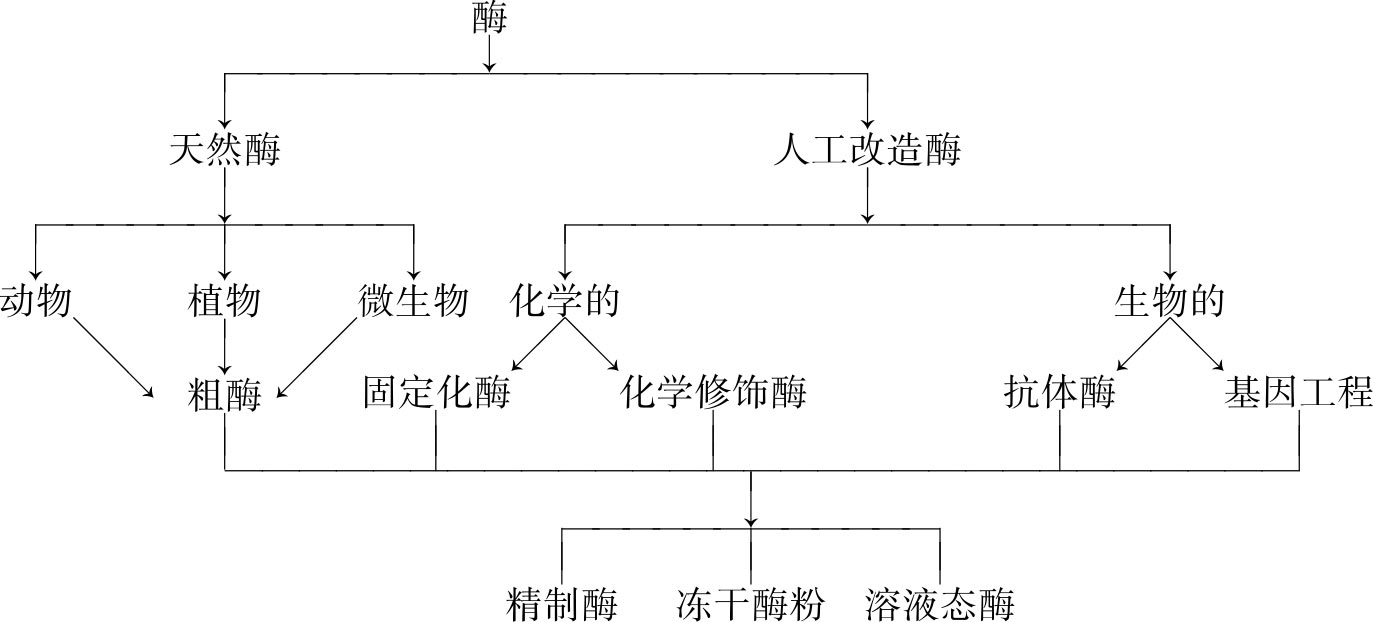 酶类制剂的来源原则上选取酶含量高的材料,可以是天然的动植物,也可以是人工培养的微生物、动植物细胞等。由于从动物内脏或植物果实中提取酶制剂受到原料限制,成本又高,因此,目前工业上大多采用培养微生物的方法来获得大量的酶制剂。另外,从理论上讲,酶也可以通过化学合成法获得,但由于试剂、设备和经济条件等诸多因素的限制,人工合成法生产酶,还需相当长的时间。