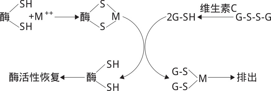 4.参与体内氧化还原反应 维生素C可作为还原剂中和体内许多氧化性物质,保护蛋白质及巯基酶不被氧化,维持其生物活性。维生素C能促使谷胱甘肽还原生成还原型谷胱甘肽(图5-13),其具有保护巯基酶不被重金属离子氧化的作用,所以维生素C具有解除重金属中毒的作用(图5-14)。维生素C可参与红细胞内高铁血红蛋白还原酶系统,促使高铁血红蛋白还原为血红蛋白,恢复其运输氧气的能力。维生素C还能促使肠道内Fe 3+ 还原为易溶解易吸收的Fe 2+ ,使食物中的铁更易于吸收,从而增强造血功能。