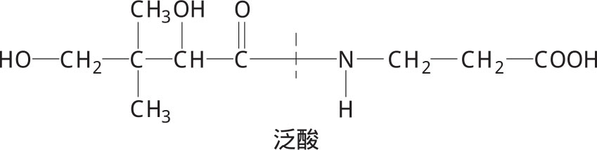 泛酸又称遍多酸、维生素B 3 (图5-10),因在动植物中分布广泛而得名。泛酸由2,4-二羟基-3,3-二甲基丁酸与β-丙氨酸通过酰胺键连接而成。浅黄色黏稠油状物,易溶于水,在热酸或碱中易分解。泛酸几乎存在于所有食物中,进入人体在肠道吸收,经磷酸化并获得巯基乙胺而生成4-磷酸泛酰巯基乙胺。4-磷酸泛酰巯基乙胺是辅酶A(CoA)及酰基载体蛋白(ACP)的主要组成成分。所以泛酸在体内的活性形式是辅酶A(CoA)和酰基载体蛋白(ACP)。