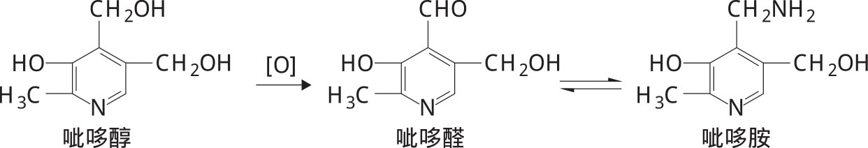 维生素B 6 又称吡哆素,包括吡哆醇、吡哆醛和吡哆胺(图5-9)。它们的化学结构和理化性质相似,在体内可相互转化,均为活化型。维生素B 6 为白色板状结晶物质,易溶于水,在空气和紫外线作用下易被分解破坏。鱼类、动物组织和酵母中维生素B 6 的含量较高,植物性食物如蔬菜、水果等含量较低。人体从食物中获取的维生素B 6 ,进入肝转变为磷酸吡哆醛和磷酸吡哆胺而发挥作用。