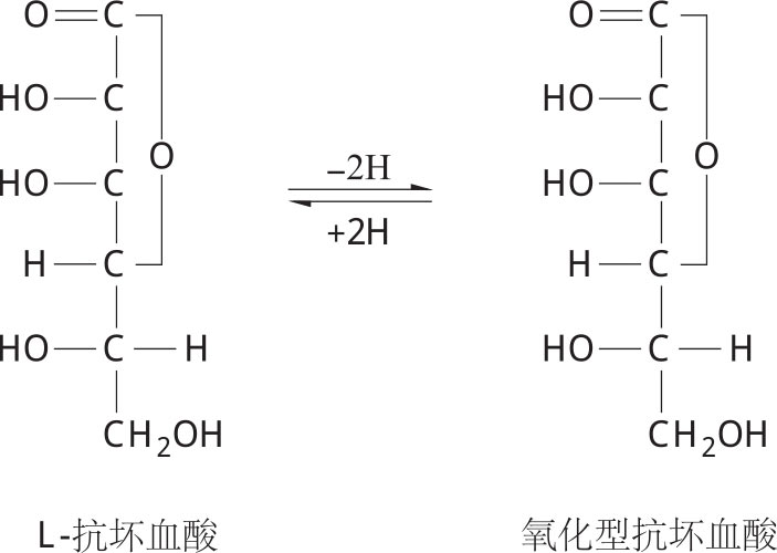 维生素C又称L-抗坏血酸(图5-12),为酸性己糖衍生物,是L-己糖酸内酯。维生素C为白色无味晶体粉末,性质稳定。但液态维生素C在暴露于空气、加热、光照、碱性和氧化酶作用下极易被氧化破坏。维生素C广泛存在于各种新鲜蔬菜和水果中,尤其在各种绿色蔬菜和柑橘属水果中含量相当丰富。但植物中的抗坏血酸氧化酶能将维生素C氧化失活,所以储存过久的蔬菜水果其维生素C含量会明显减少。