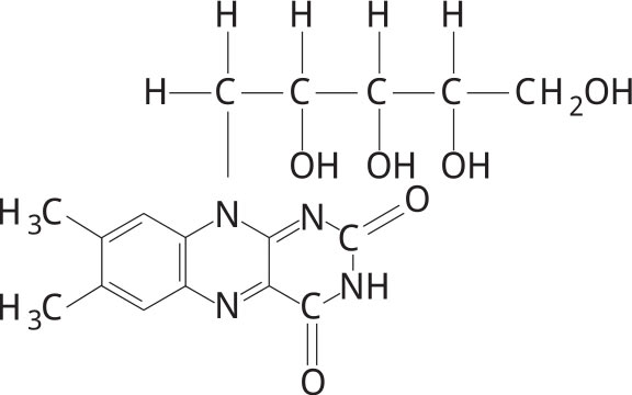 维生素B 2 又名“核黄素”,是核醇与7,8-二甲基异咯嗪的缩合物(图5-7)。维生素B 2 因异咯而呈橙黄色晶体物质,能溶于水,但溶解度低,易溶于碱性溶液。耐酸、耐热,但对光和紫外线极为敏感,容易被分解破坏。维生素B 2 来源广泛,在奶类、蛋类、肉类、谷类、根茎类植物及蔬菜水果中都有较多含量。维生素B 2 在体内的活化形式有两种:黄素单核苷酸(FMN)和黄素腺嘌呤二核苷酸(FAD)。人体从食物中摄取维生素B 2 后,在小肠黏膜黄素激酶的作用下可转变为黄素单核苷酸(FMN);然后在组织细胞内焦磷酸化酶的进一步催化作用下生成黄素腺嘌呤二核苷酸(FAD)。