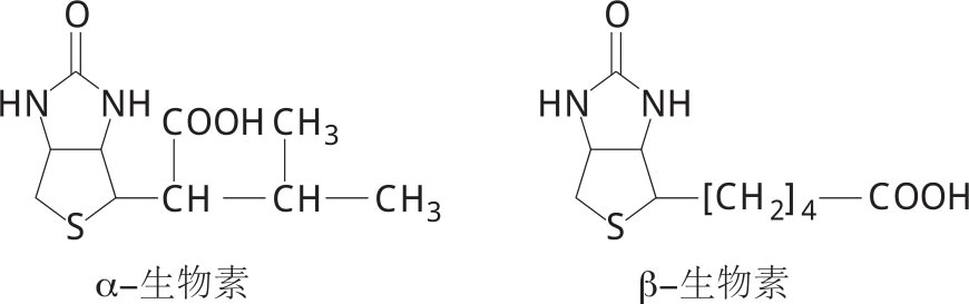 生物素又称维生素H、维生素B 7 (图5-11),为无色针状的结晶物。在常温下性质比较稳定,耐酸不耐碱,受热和氧化剂的作用会失去活性。生物素广泛存在于动物性和植物性食品中,如动物肝、瘦肉、鸡蛋、奶类、酵母、鱼类、蔬菜水果等。
