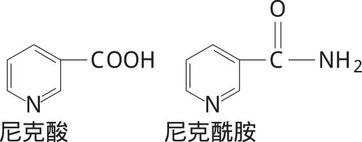 维生素PP又称“抗癞皮病维生素”,是一类吡啶的衍生物,包括尼克酸(烟酸)和尼克酰胺(烟酰胺)两大类(图5-8)。烟酸的化学本质是吡啶-3-羧酸,在体内可转变为具有生物活性的烟酸酰胺。烟酸性质稳定,在受光照、空气、加热和碱的作用时不易被分解破坏。维生素PP在植物中主要以烟酸的形式存在,在动物中则常以烟酰胺形式存在。