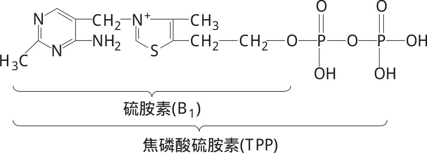 维生素B 1 也叫抗脚气病维生素,分子由含硫的噻唑环和含氨基的嘧啶环通过甲烯基连接而成,属于胺类,故称为硫胺素。纯品为白色结晶,极易溶于水,耐酸,在中性或碱性环境中不稳定,遇光和热效价下降,故应置于避光、阴凉处保存,不宜久贮。维生素B 1 易被小肠吸收,入血后主要在肝及脑组织中经硫胺素焦磷酸激酶催化生成焦磷酸硫胺素(TPP)才能发挥作用,TPP是维生素B 1 在体内的活性形式(图5-6)。