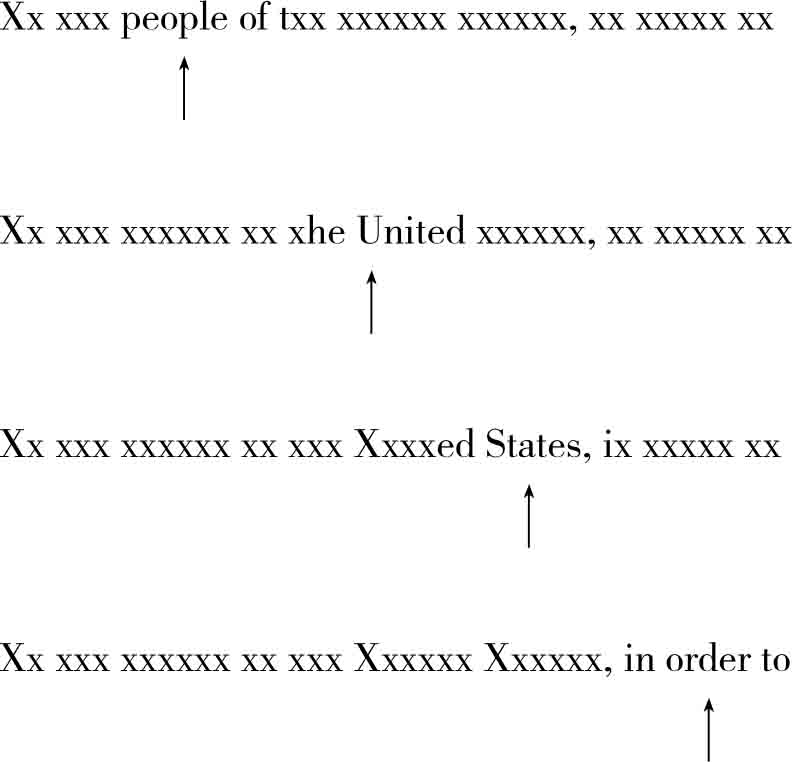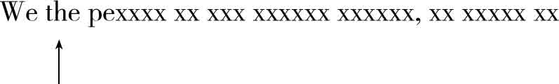 正如电影《黑客帝国》中的超级电脑一样,笛卡尔所描绘的邪恶魔鬼用精细的人造信号冲击我们的脑,为我们制造出一个伪现实、一个真实的幻境、一个虚拟布景,而其后的真实景象则永远被隐藏。麦康基和雷纳的方法则相对温和得多,他们设计了一种电脑屏幕上的“移动窗口”,可以让人产生看到完整文本的错觉 5 。他们的方法是给一名被试(参加实验的人)戴上特制的眼动捕捉装置,并实时地改变屏幕上的显示内容。这个装置可以经过编程设置,让电脑屏幕上只显示注视中心左右的几个字母,而整页文字的其他字母都用一串串的“x”来代替: