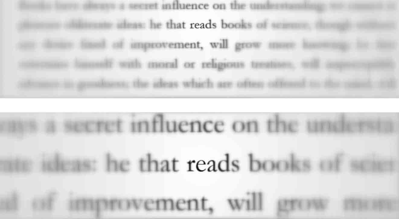 也许你会认为,在这样的条件下,决定着阅读难易程度的因素是印刷字体的大小,小字会比大字更难辨识。然而奇怪的是,事实并非如此。因为字越大,字所占据的视网膜空间就越大。而当我们用大字号印出一个单词时,单词就会被扩展到视网膜的边缘,而在这个边缘区域,不论字有多大,辨认起来都是力不从心的。让辨认变得容易与不容易的两个因素几乎完全相互抵消,所以一个巨大的单词和一个微小的单词从视网膜感觉精度的角度来说,本质上并没有什么区别。当然了,前提条件是这个单词不能太小,至少大于人眼中央凹所能精细分辨的极限。而对视力减退的人,例如老年人,把字印大一点还是很有道理的。