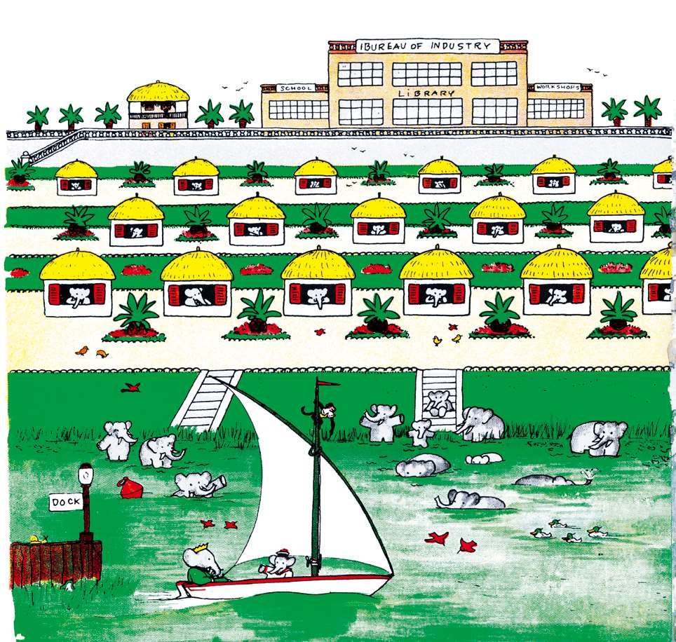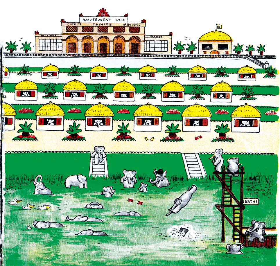 Here is Celesteville! The elephants have just finished building it and are resting or bathing. Babar goes for a sail with Arthur and Zephir. He is well satisfied, and admires his new capital. Each elephant has his own house.