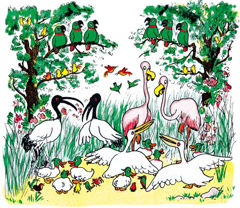 The birds also gathered together to discuss what the elephants were up to. The pelicans and the flamingos, the ducks and the ibis and even the smaller birds all twittered, chirrupped and quacked, and the parrots enthusiastically kept repeating:“Come and see Celesteville, the most beautiful of all cities!Come and see Celesteville, the most beautiful of all cities!”
