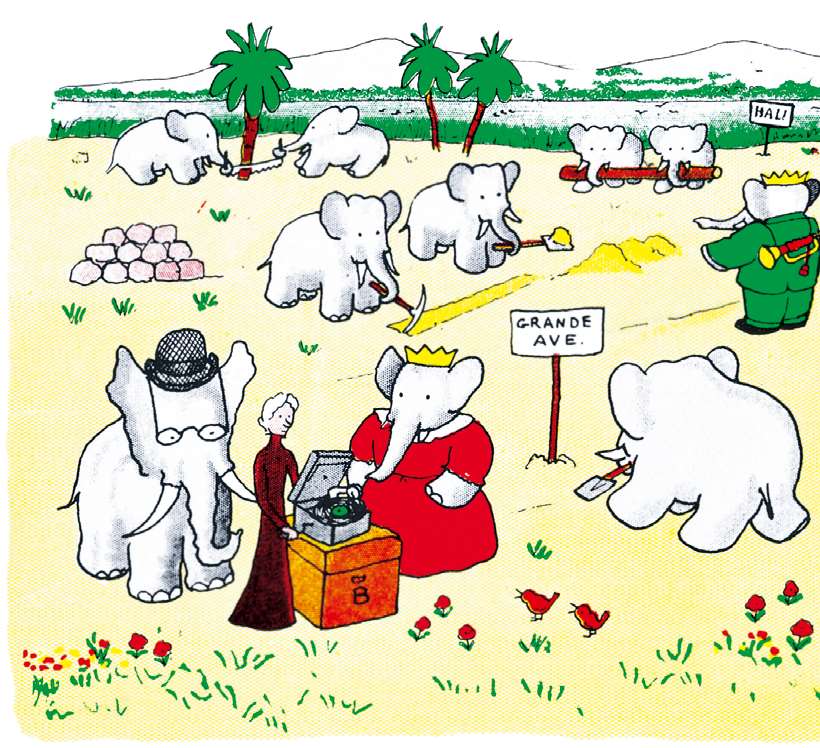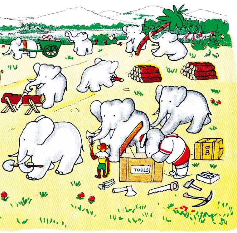 大象们立马热火朝天地干起活儿来。亚瑟和泽飞尔负责将工具分给大家。巴巴则负责给每个人指派工作。他在指示板上标记出哪里要修街道,哪里要建房屋。他分派给大象们不同的任务,有的去砍伐树木,有的去搬运石头,有的去锯木头,还有的去挖坑。大伙儿都尽力将自己的事做好,这真是令人开心啊!老夫人打开留声机播放音乐给大家听,巴巴喜欢音乐,便时不时地为大伙儿吹吹喇叭。所有的大象都和他一样开心。他们开心地干着活儿,有的在给房屋钉钉子,有的在拖拽木头,有的拉,有的推,有的挖,还有的将东西搬来搬去,干活期间他们的耳朵都张得大大的。