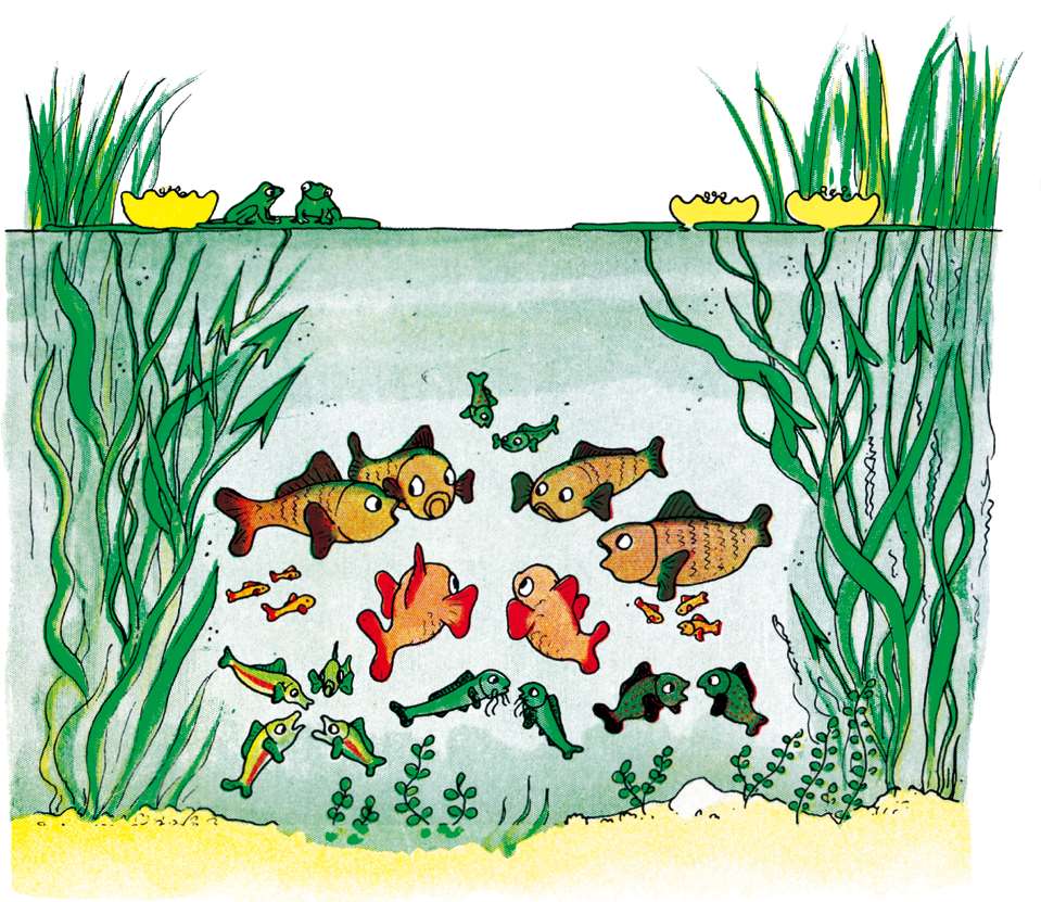 Over in the big lake, the fish are complaining among themselves: “We can't even sleep peacefully any longer,”they say. “These elephants make the most dreadful noise!What are they building? When we jump out of the water we really haven't time to see clearly. We'll have to ask the frogs what it is all about.”