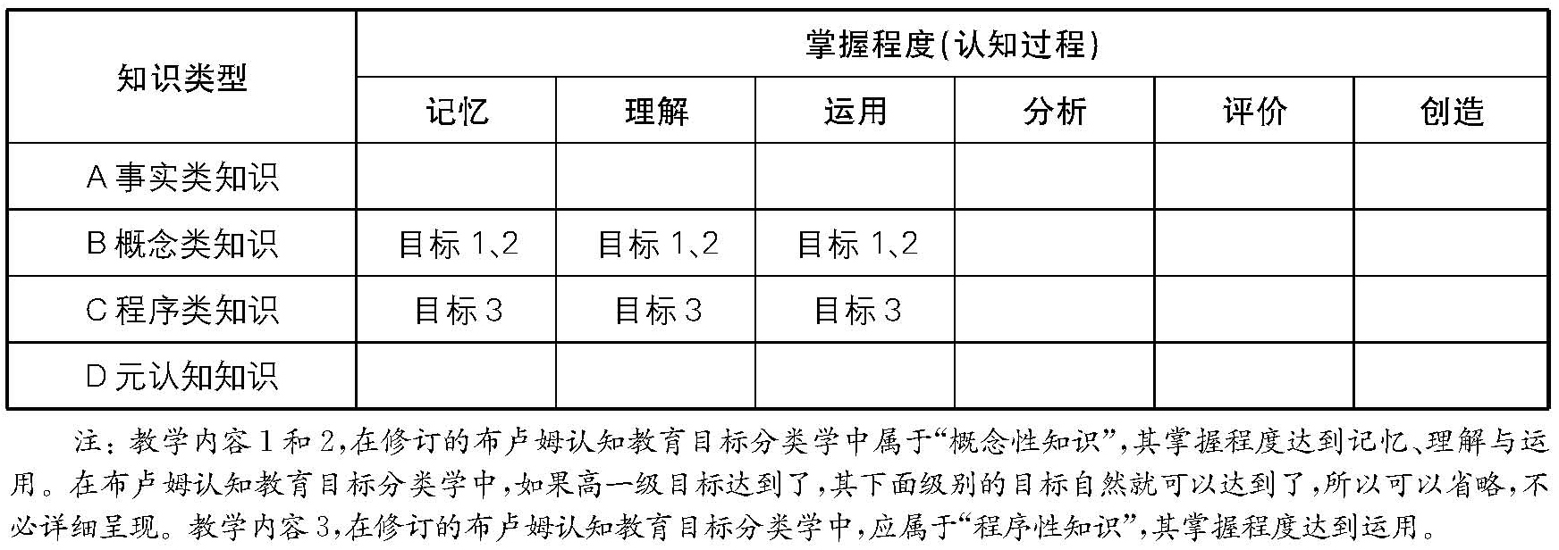 将目标置于修订的知识与认知过程两维目标分类框架表中(见上表),本课教什么,教到什么程度,一目了然。