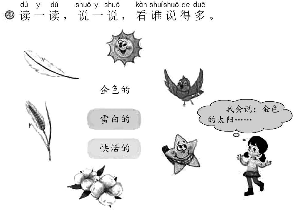 7.小结:这些带有“的”字的词语,都是形容后面这个“什么”,构成“怎么样(的)什么”的词组,使后面这个名词更形象具体。读的时候要在“的”字后面短暂停顿一下,而且“的”字要读成轻声。