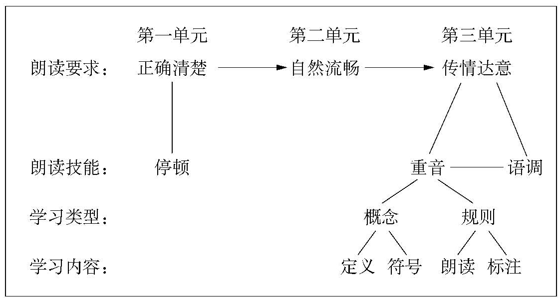所谓起点能力,行为主义心理学家称之为起点行为,是指学生已有的与新学习有关的能力或倾向的准备水平。从本册教材朗读技能内容安排框式图解可知,重音在三个朗读技能中处于中间位置,那么,学生在学习“重音”这一概念时,已经具备以下朗读能力:(1)学会了朗读课文中的停顿;(2)能正确清楚、自然流利地朗读课文。这就是学生学习“重音”的起点能力。因为如果学生做不到正确清楚,咬字不准,多字、漏字,做不到“自然流利”所要求的“态度自然大方、停顿合理、速度恰当、语气顺畅”,又怎能传情达意呢?可见,“正确清楚、自然流畅”地朗读课文是学生已有的旧知识、旧能力,而这些能力与学生要学的新能力有关,它们之间的关系是承接的。