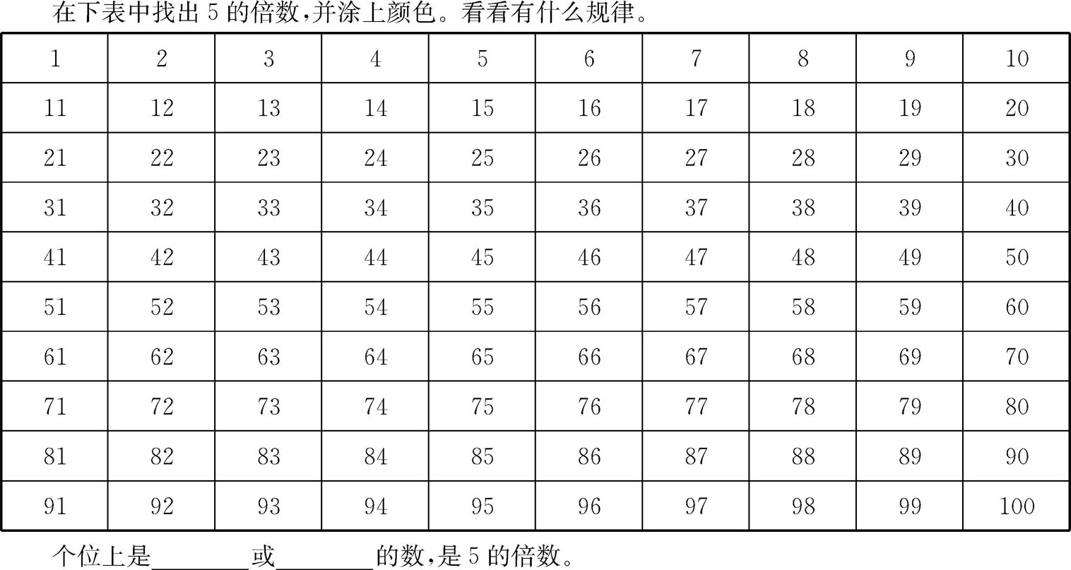 “2,3,5的整除特征”通常是小学五年级的课程内容。其教学过程大致来说是通过观察和比较一些具体特例,找到“变化中的不变因素”,而后归纳出结论。以“5的整除特征”为例,人民教育出版社出版的义务教育课程标准实验教科书《数学(五年级下册)》关于这一内容的安排为,先在1—100的数表中找到“5”的倍数,然后发现其个位数字都是“5”或“0”,因此得到“个位数字为5或0的数是5的倍数”的结论(见图2-3)。