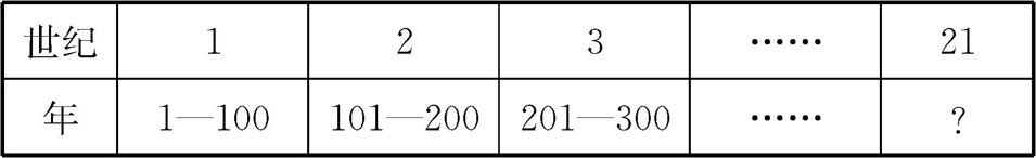 观察图2-2,纵向看公元1世纪最后一年是公元100年,公元2世纪最后一年是公元200年,依此类推可以得到初步结论:“公元n世纪最后一年的年数是n×100。”据此就可以初步得到结论,21世纪最后一年是2100年,因此倒推100年得到21世纪第一年是2001年。